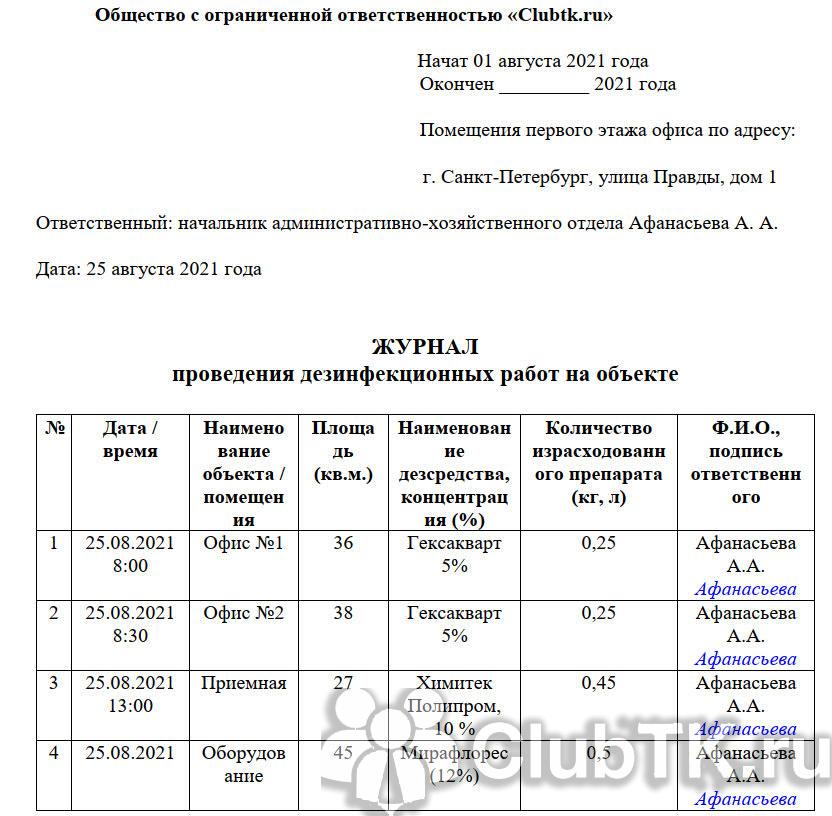 А это пример заполненного журнала работ по санитарной обработке помещений: