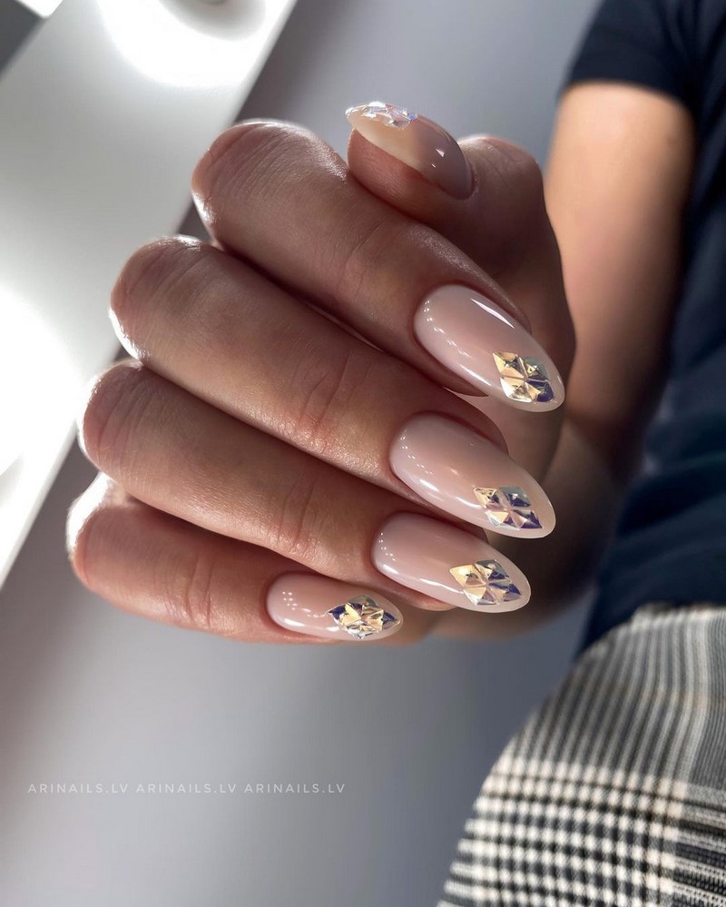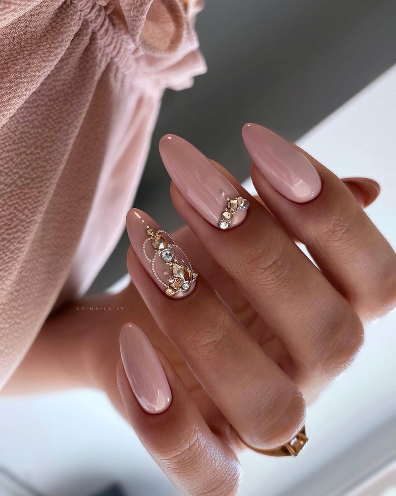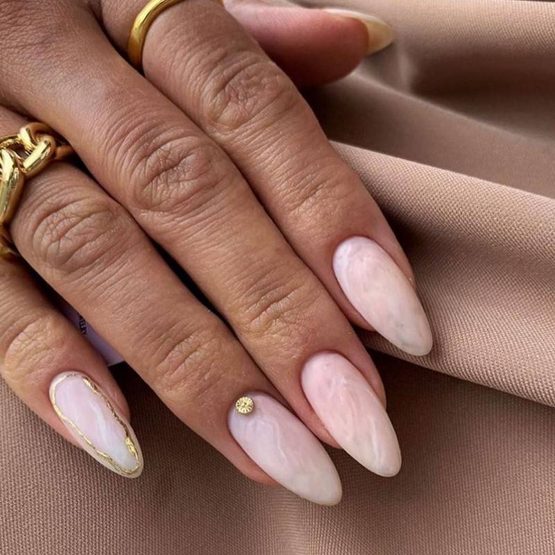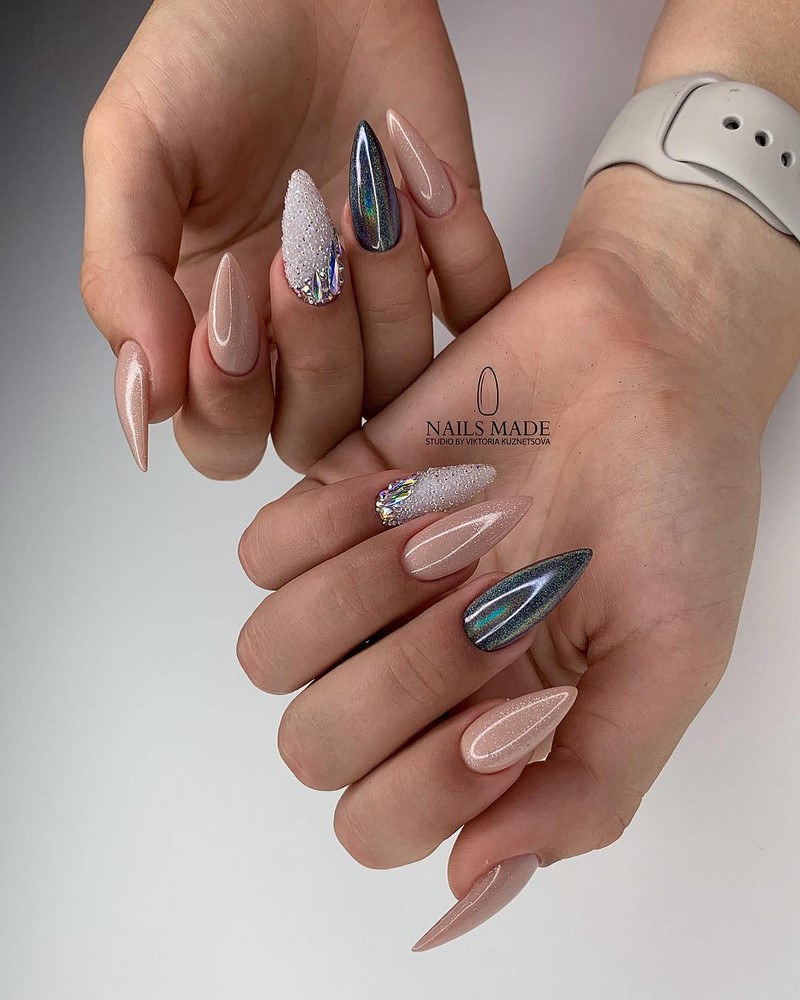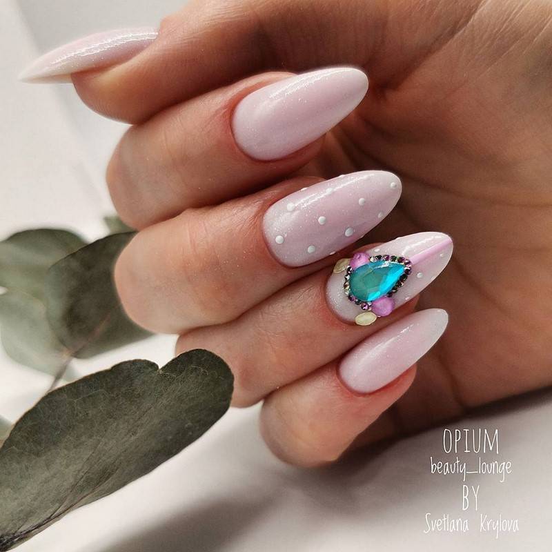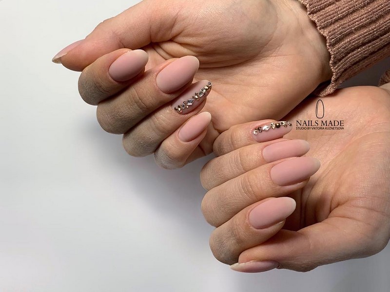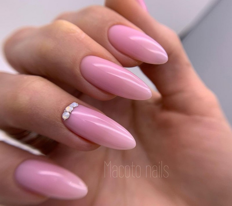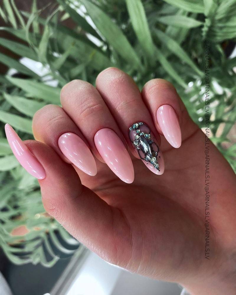 Острая форма ногтей сама по себе привлекает много внимания. Нейл-стилисты советуют оформить ее как можно проще — нюдовая база с выделением одного или двух ногтей. В качестве декора можно выбрать традиционные стразы, втирку, рисунки.