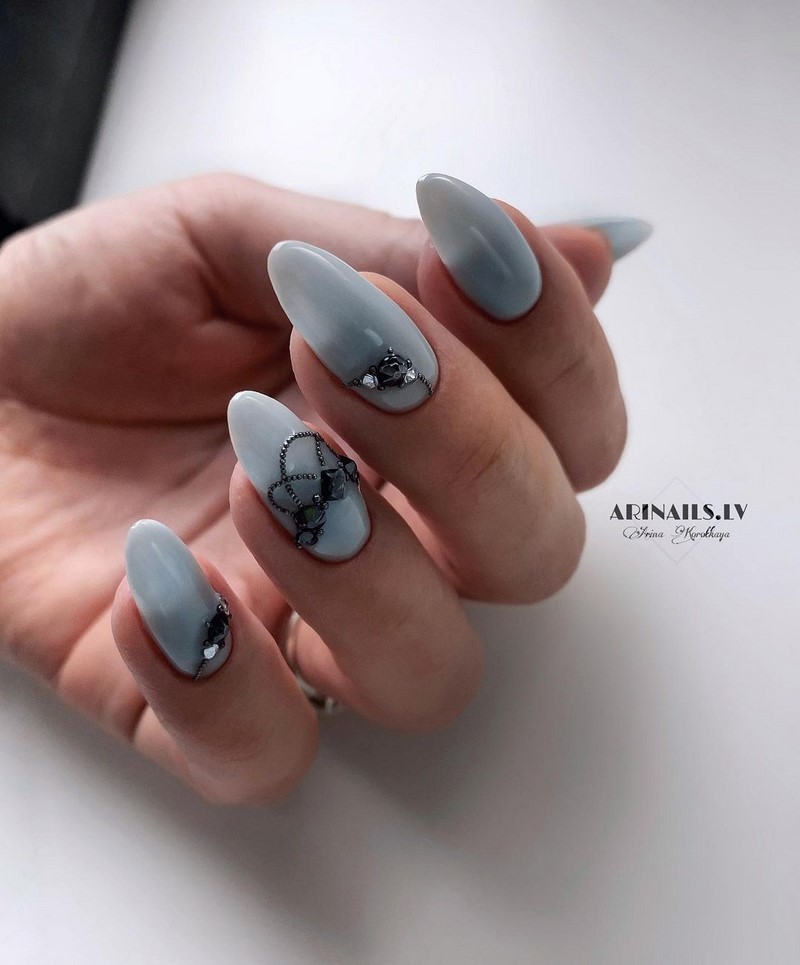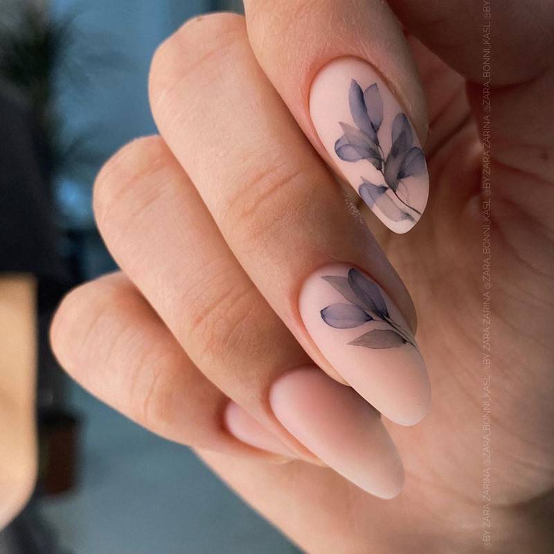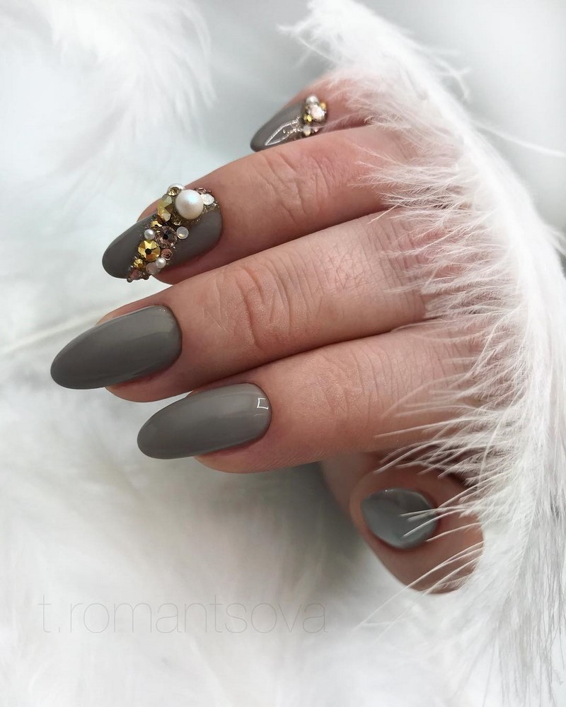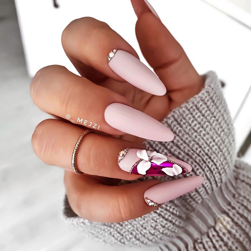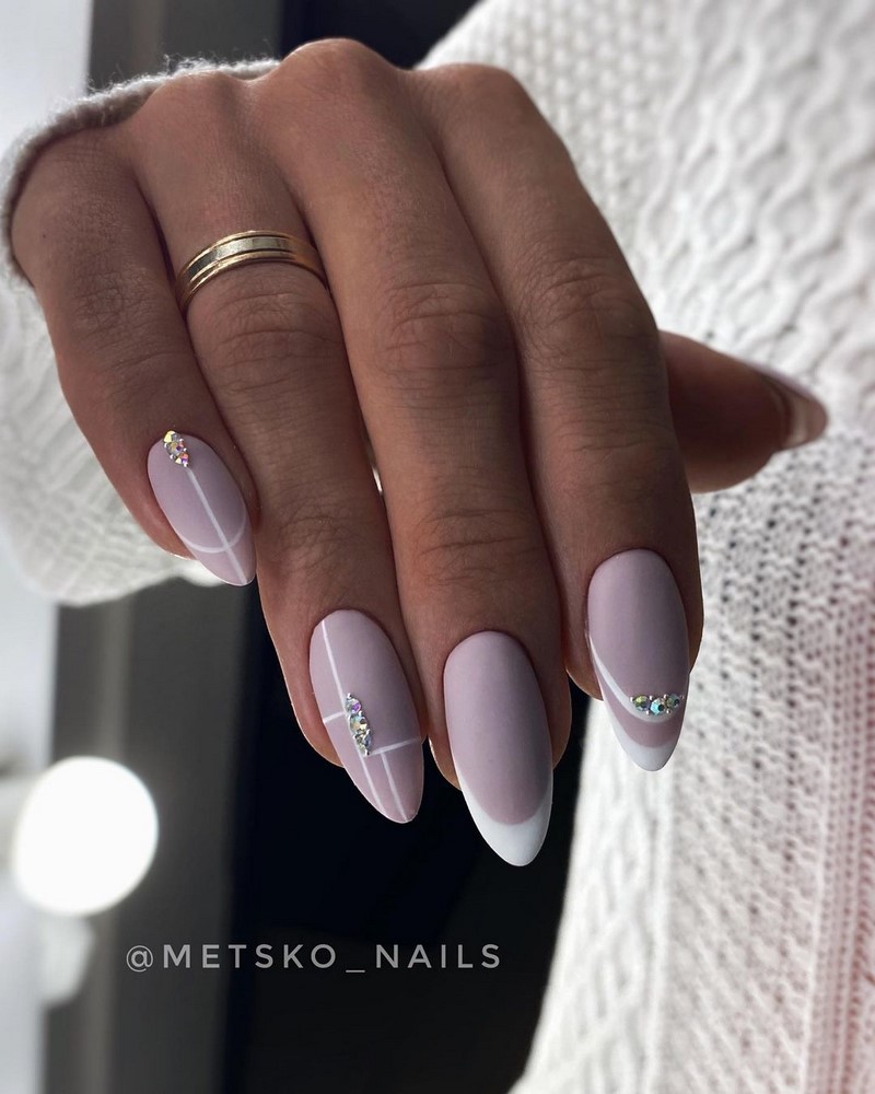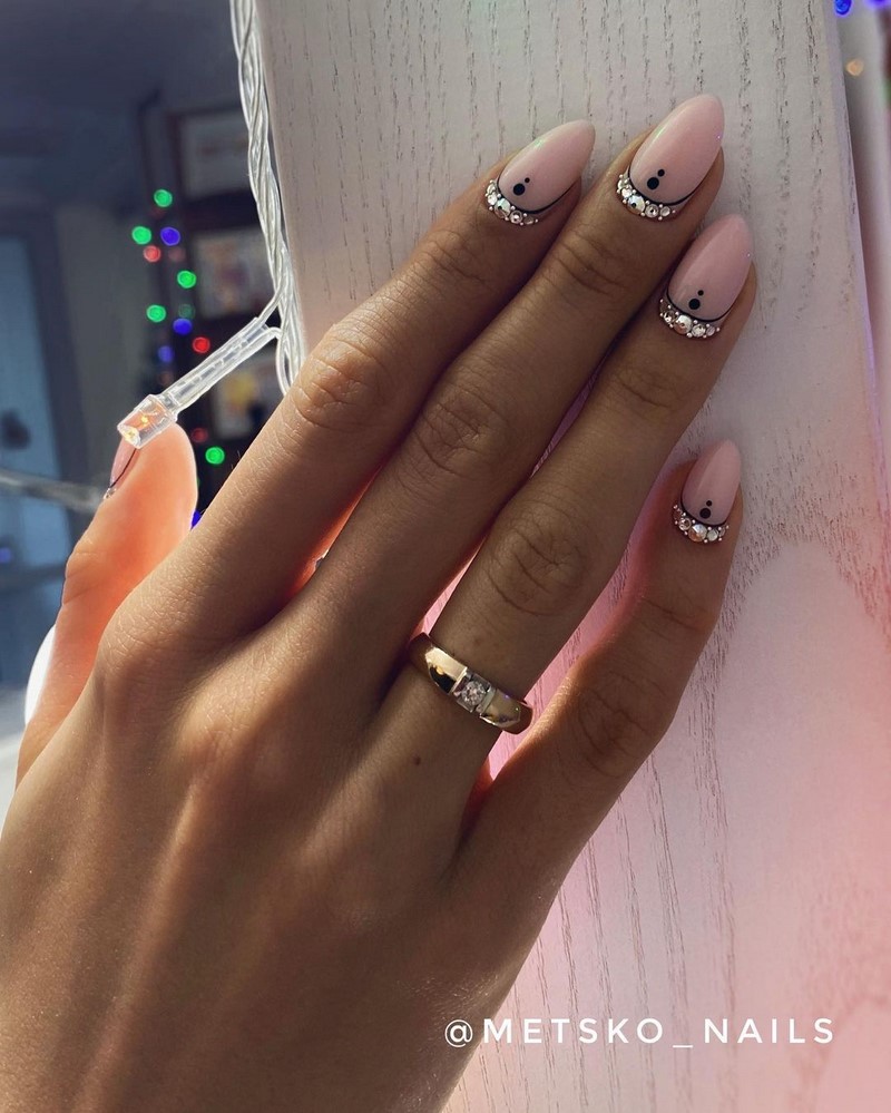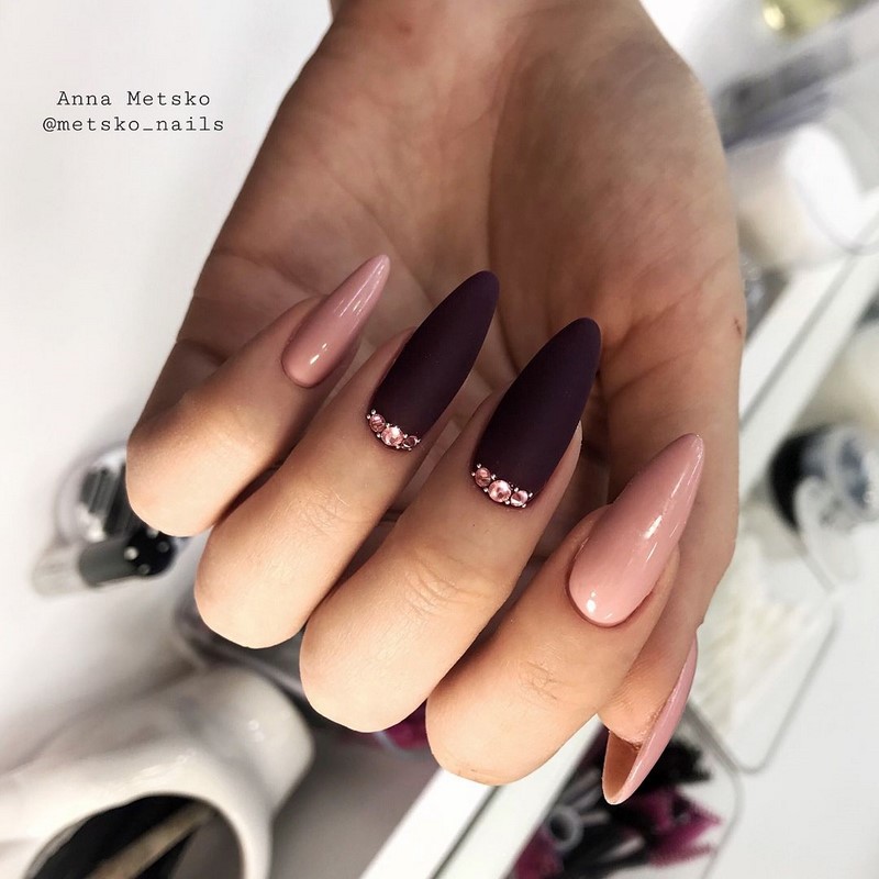 Острая форма ногтей сама по себе привлекает много внимания. Нейл-стилисты советуют оформить ее как можно проще — нюдовая база с выделением одного или двух ногтей. В качестве декора можно выбрать традиционные стразы, втирку, рисунки.