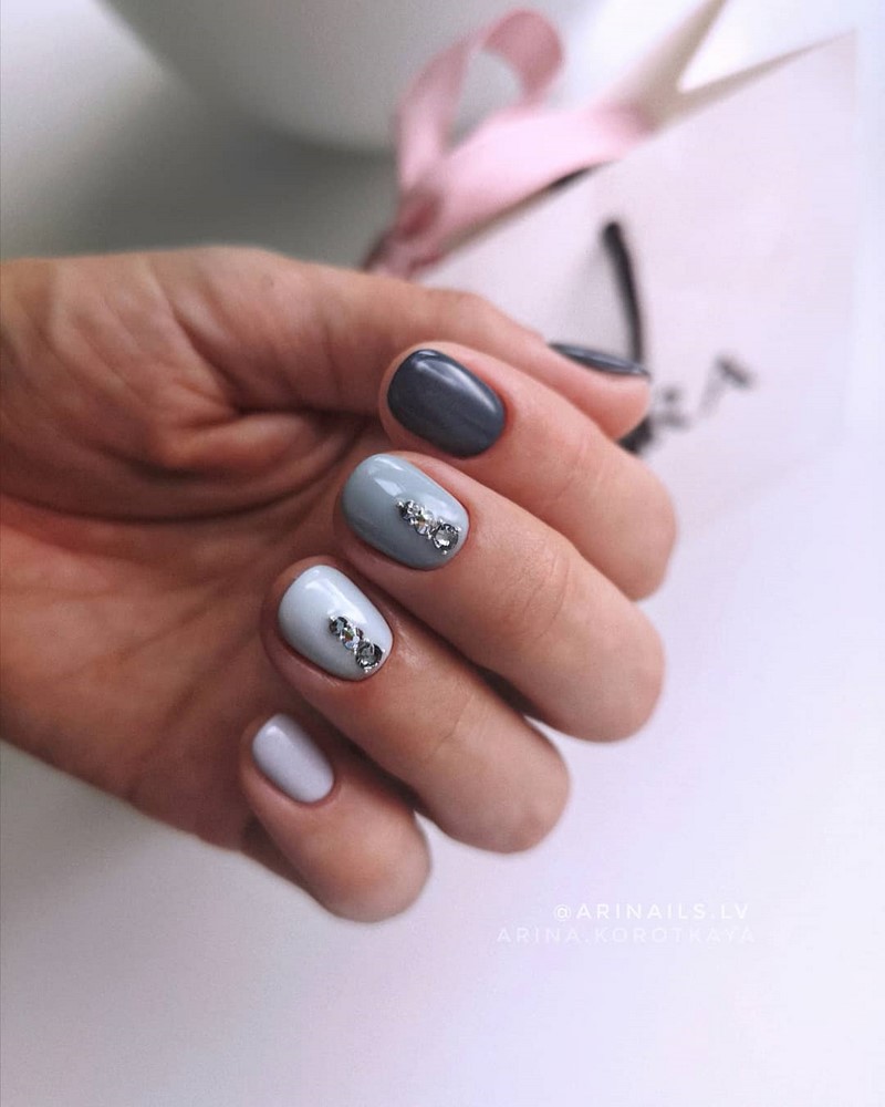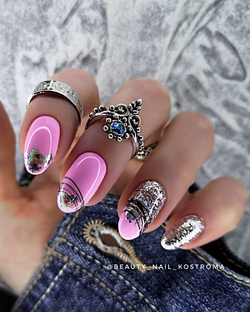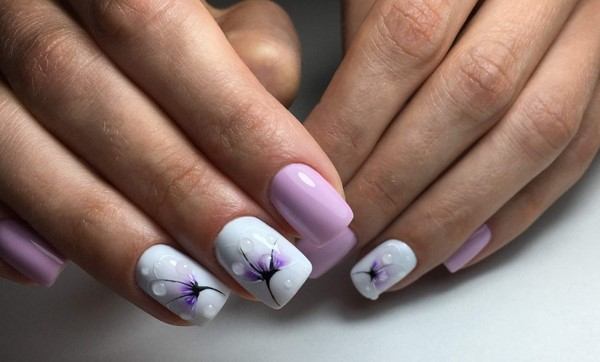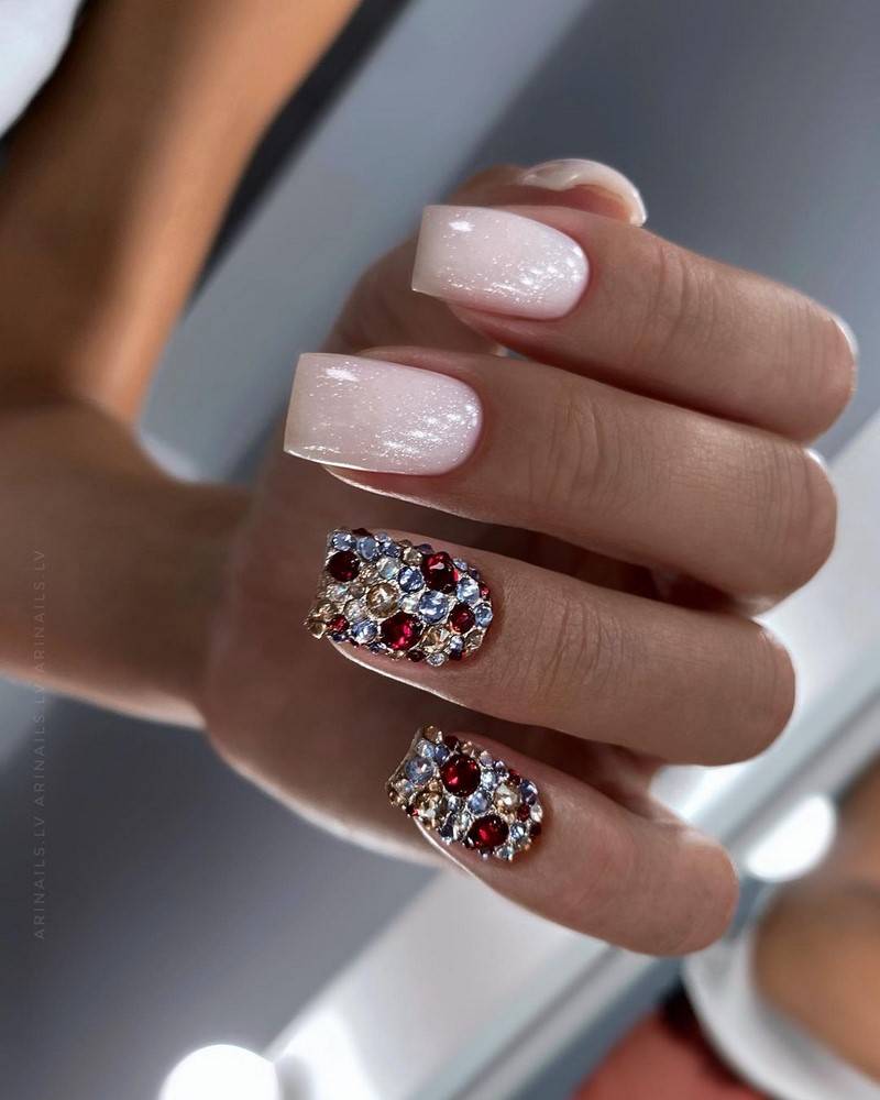 Окрашенные двумя или несколькими цветами ногти также должны быть красиво и аккуратно украшены, стразами, блестками, цветками, кружевами.