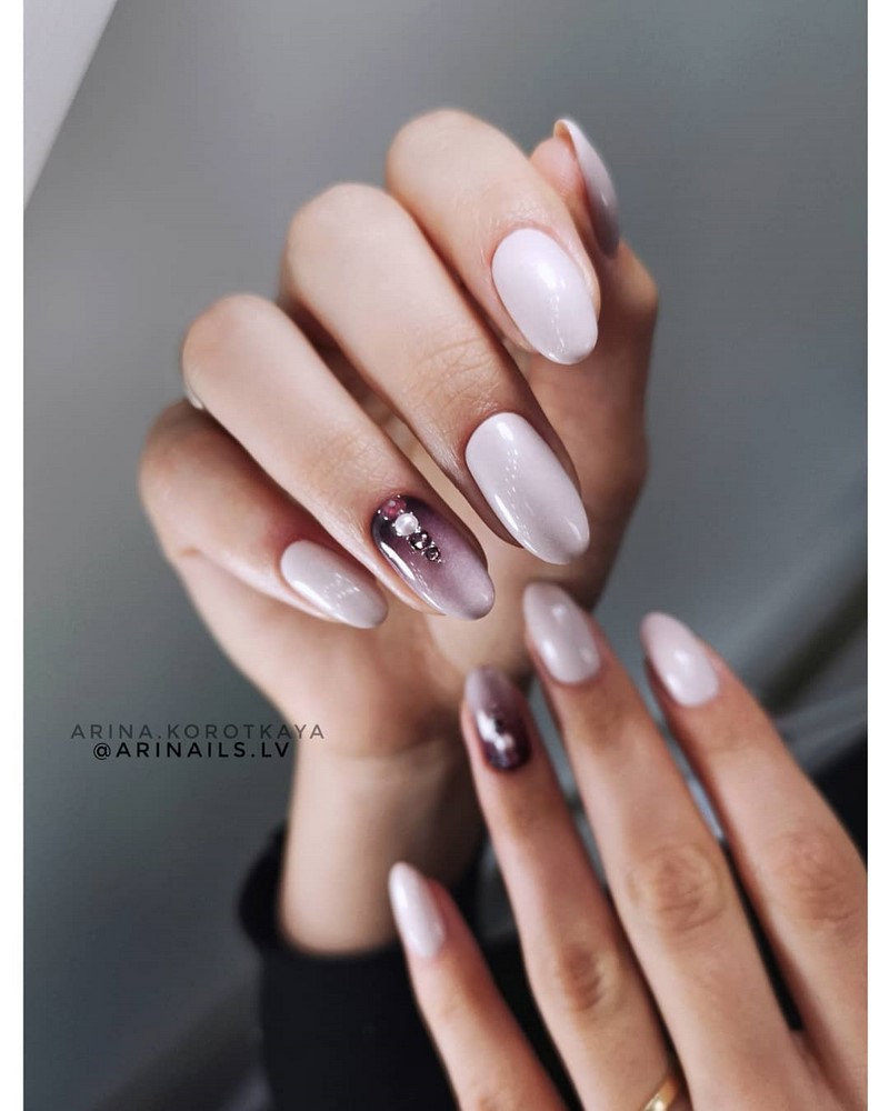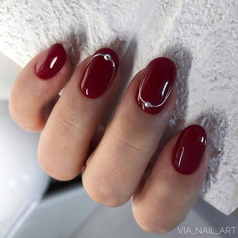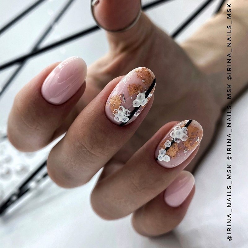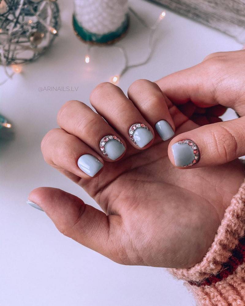 Тренд сезона — однотонное покрытие в сочетании с прозрачной базой, на которую нанесен рисунок — нежные цветы, кружево или обычные фольгированные полоски. Отлично смотрится и лунный маникюр с минималистичным выделением небольшими камнями.