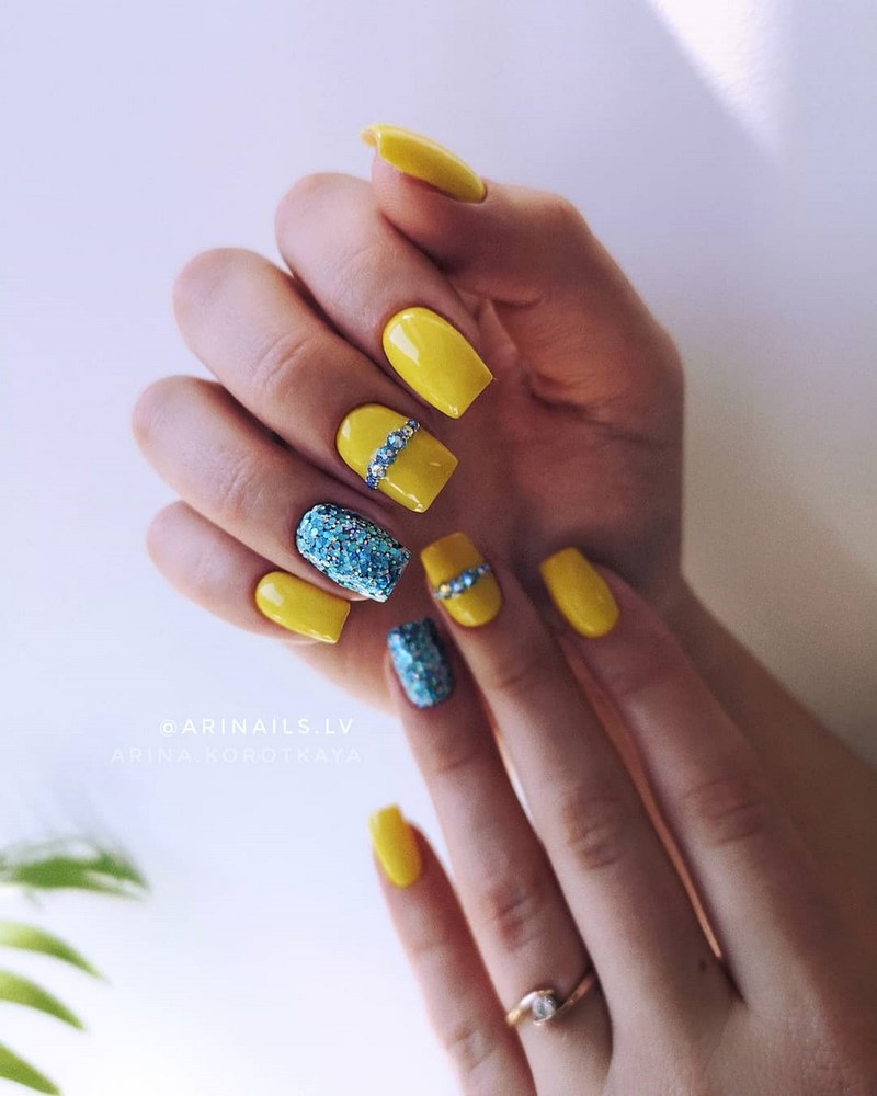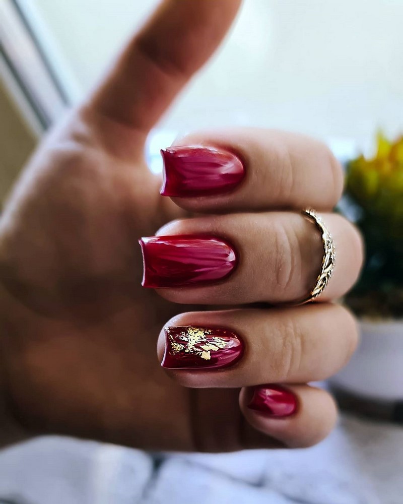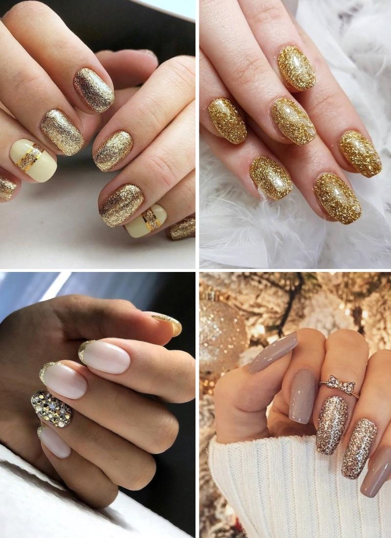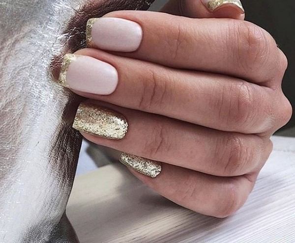 Золотой маникюр стал настоящим хитом в текущем году, так как в сочетании с обручальными кольцами он смотрится особенно эффектно. Выполняется золотой дизайн чаще всего мелкими блестками, а также специальной фольгой для нейл-арта, которая имитирует настоящее золото.