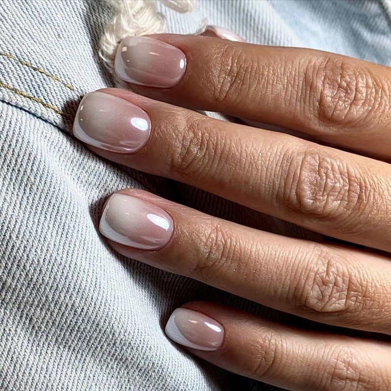 - Свадебное омбре, выполненное глянцем, смотрится безупречно. Переход от одного оттенка к другому очень плавный, его границы практически не ощущаются;