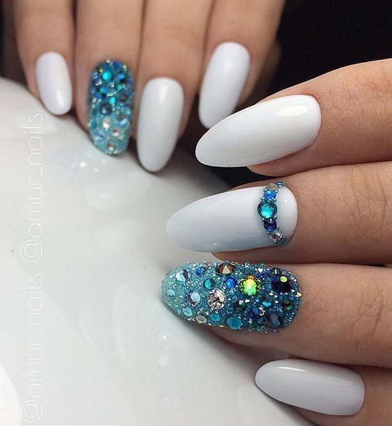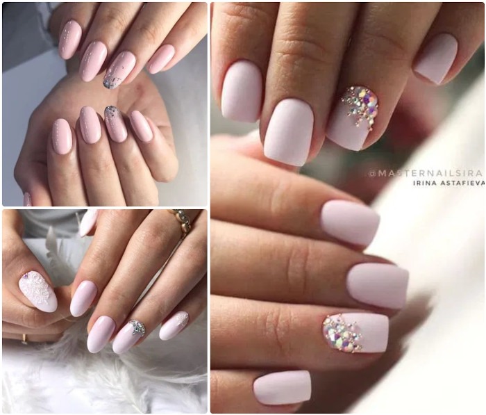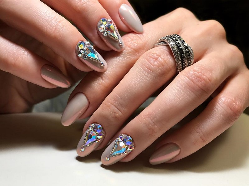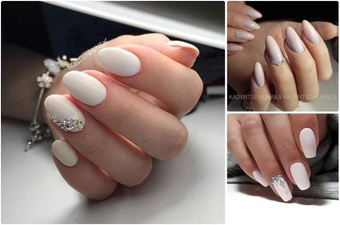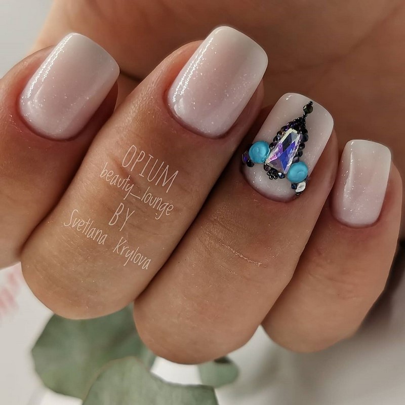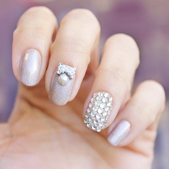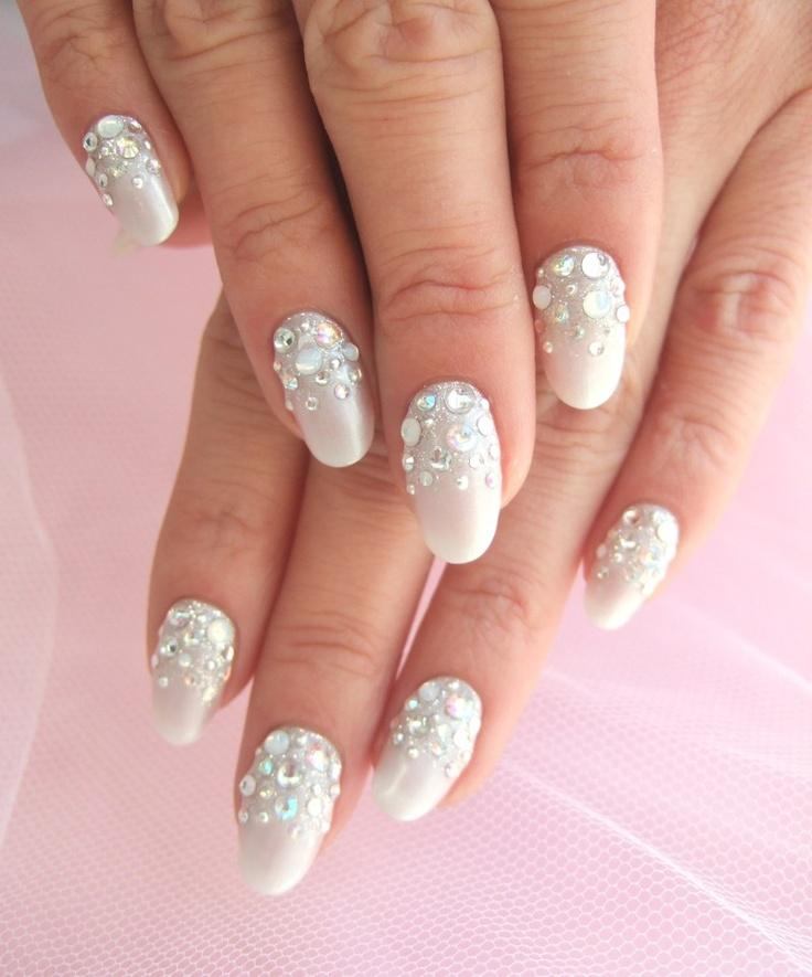 Эти мелкие блестящие камушки очень красиво мерцают на солнце и в искусственном свете, привлекая внимание к рукам невесты. Однако современная мода предполагает размещение таких украшений на отдельных ногтях, ни в коем случае, не на всех, иначе это будет выглядеть не нежно и привлекательно, а вульгарно.