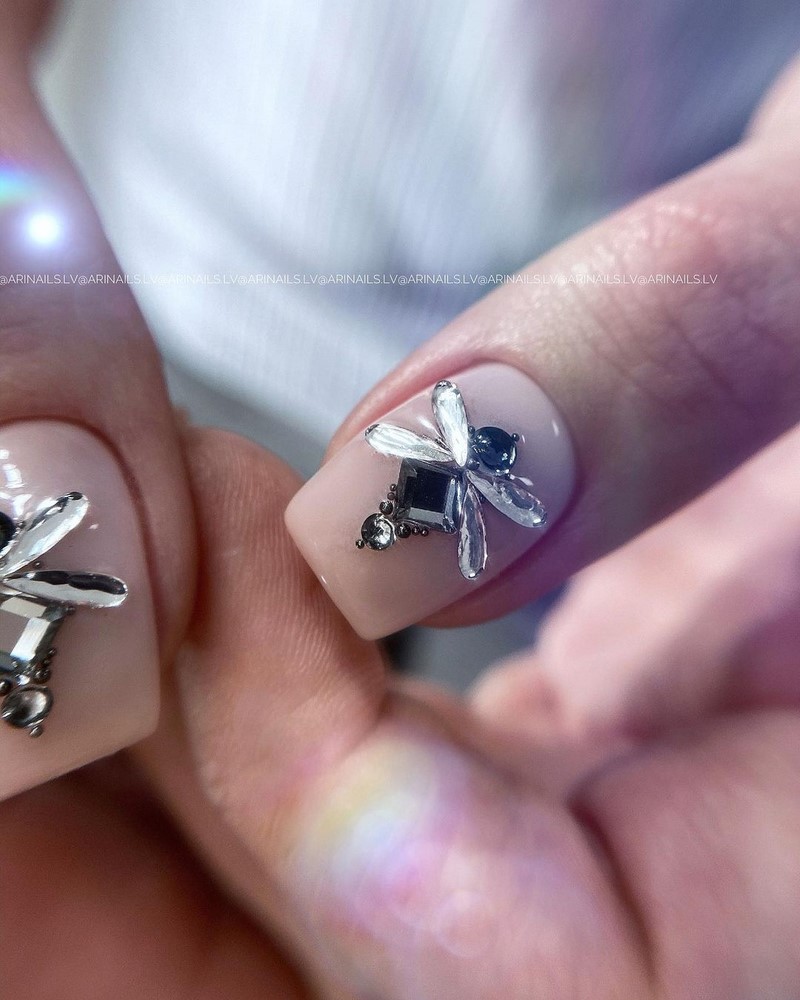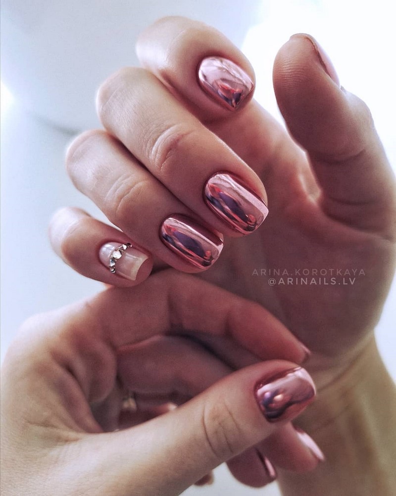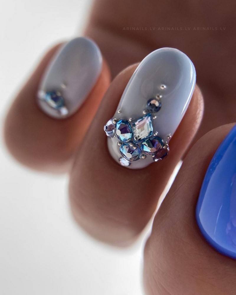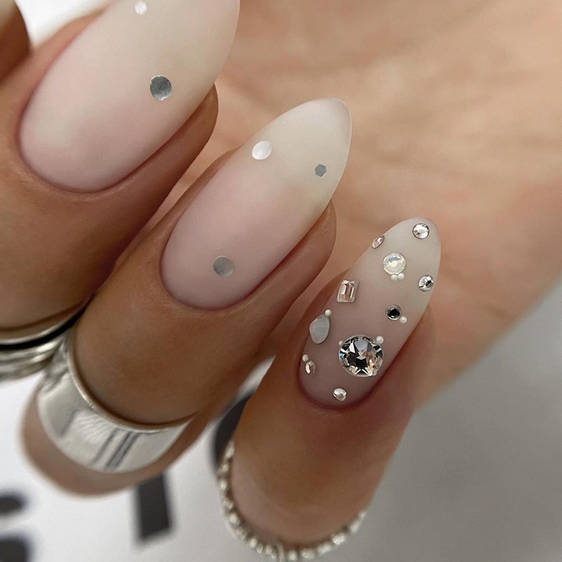 Эти мелкие блестящие камушки очень красиво мерцают на солнце и в искусственном свете, привлекая внимание к рукам невесты. Однако современная мода предполагает размещение таких украшений на отдельных ногтях, ни в коем случае, не на всех, иначе это будет выглядеть не нежно и привлекательно, а вульгарно.