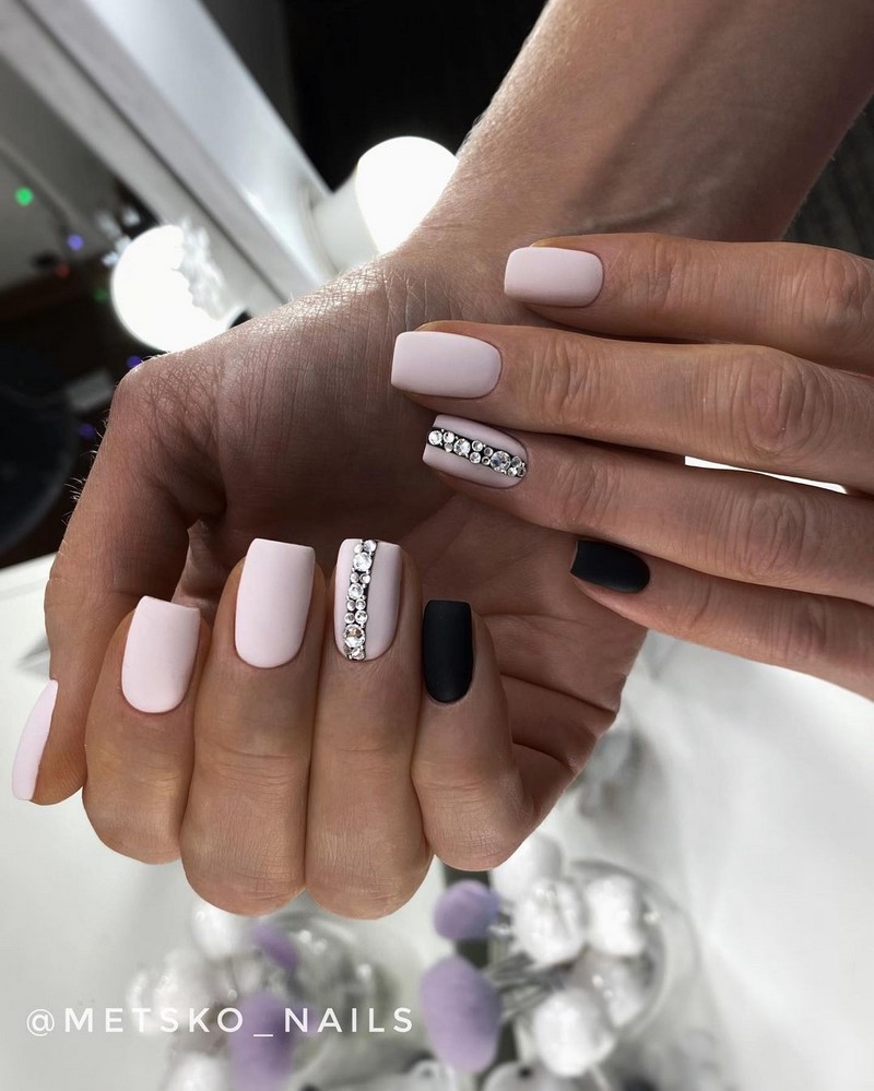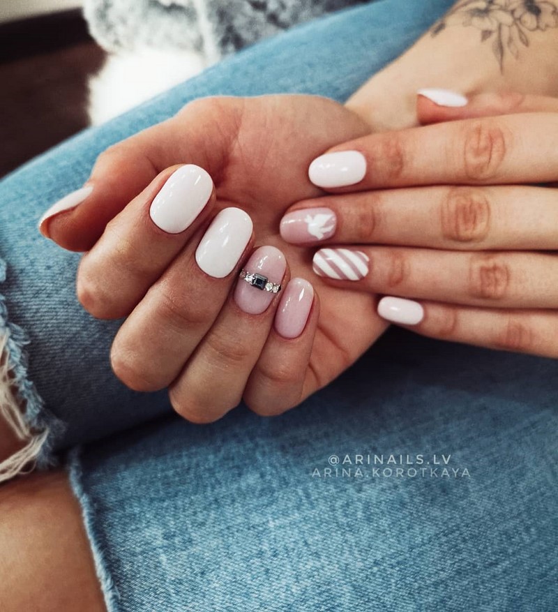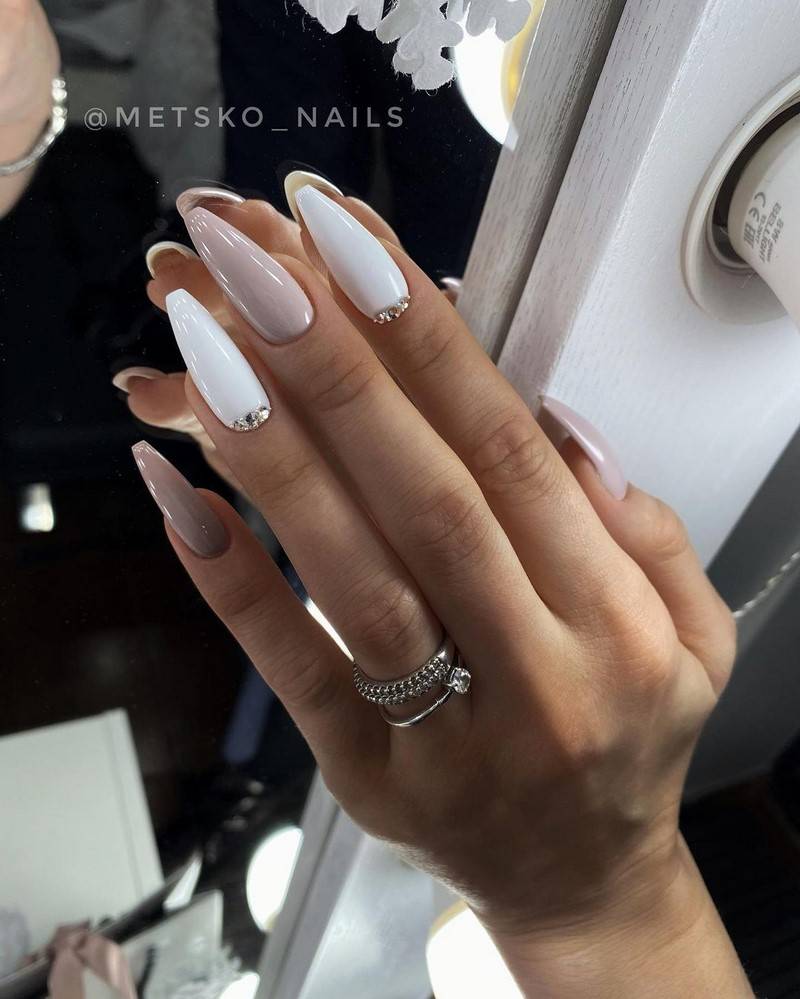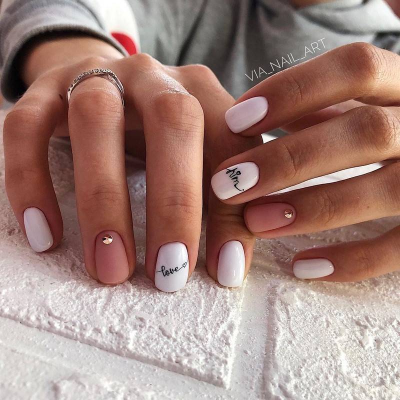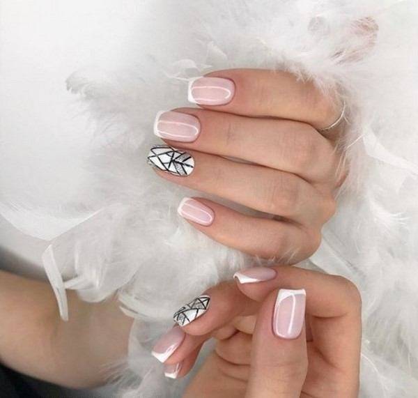 Комбинированный маникюр, состоящий из разных цветов, таких как, например, черный и белый, белый и розовый, и дополненный привлекательными, но умеренными украшениями. Если невеста смелая и хочет более экстравагантное украшение, можно добавить к нему жемчуг, драгоценные камни или другие 3D-украшения.