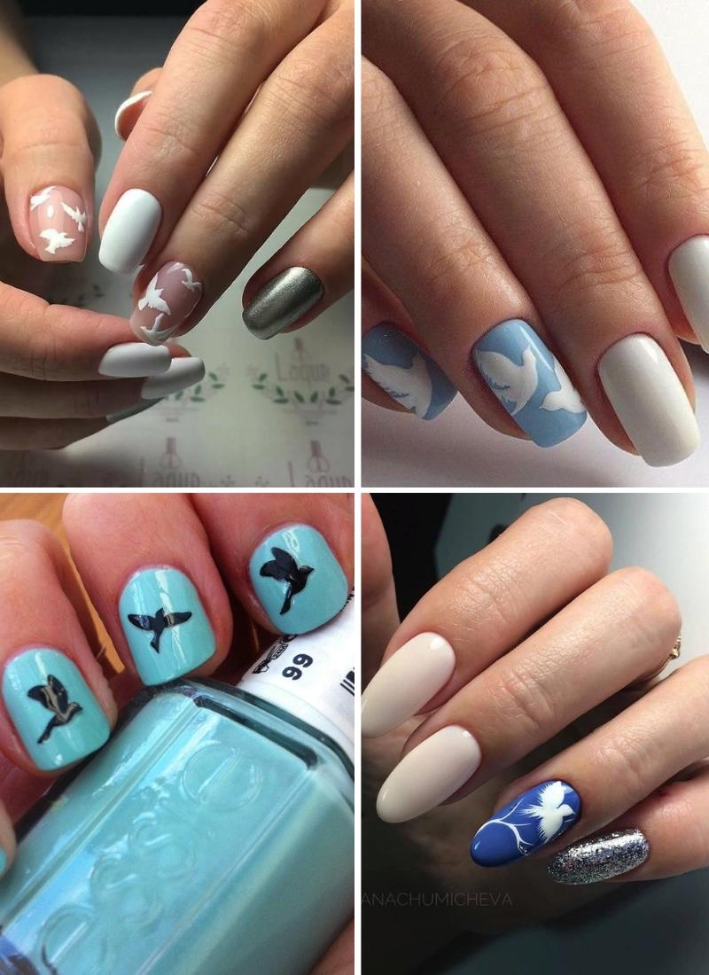 Голубь – традиционная свадебная птица, поэтому неудивительно, что среди модных видов маникюра для этого дня, есть декор такого вида. Белые голуби смотрятся очень изящно, они могут дополнять нежно-голубую основу, присутствовать только на 1 ногте, чтобы разнообразить френч или иной вид дизайна.