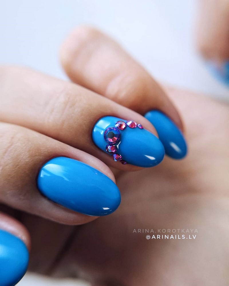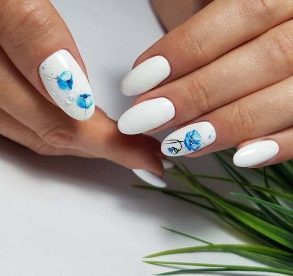 Миндальный свадебный маникюр в нежно-голубых тонах – еще один тренд этого года. Его могут взять на вооружение невесты как в платьях подобных тонов, так и в традиционных белоснежных нарядах. Лаконичная голубизна ногтей подчеркнет хрупкость образа новобрачной. Можно сделать френч в сочетании с белым, украсить маникюр цветами контрастного оттенка, либо добавить кружево.