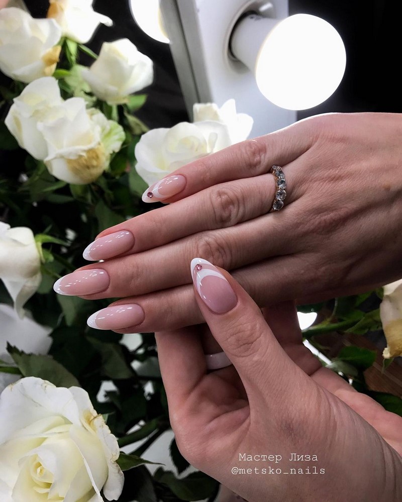 - Полумесяц маникюр — с ним невеста не только очень женственная, но и очень элегантно выглядит . Этот вид нейл-арта привносит нотку винтажности в стиль невесты. К тому же это универсальный и практичный маникюр, с которым бизнесвумен после свадьбы может спокойно уйти в офис, не навредив своему имиджу;