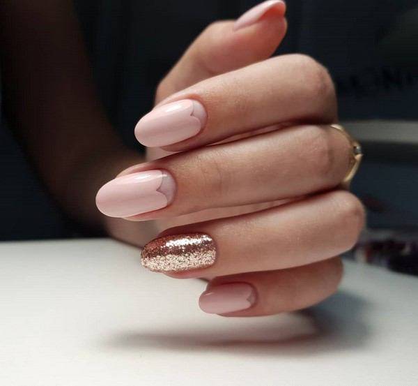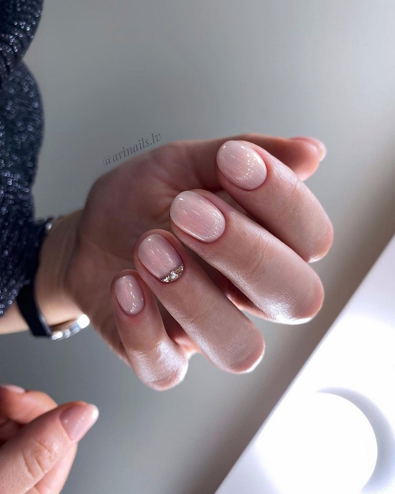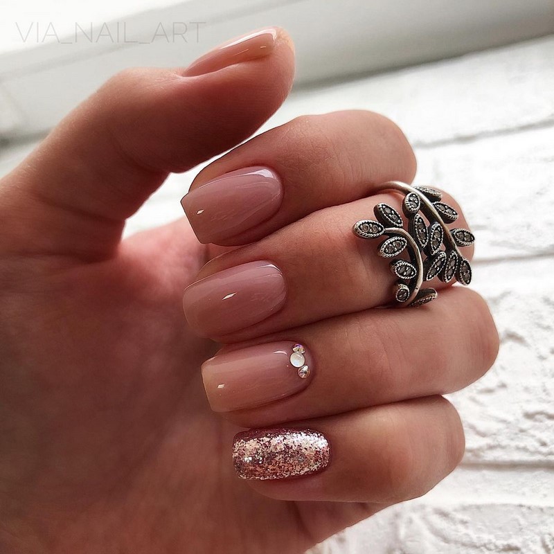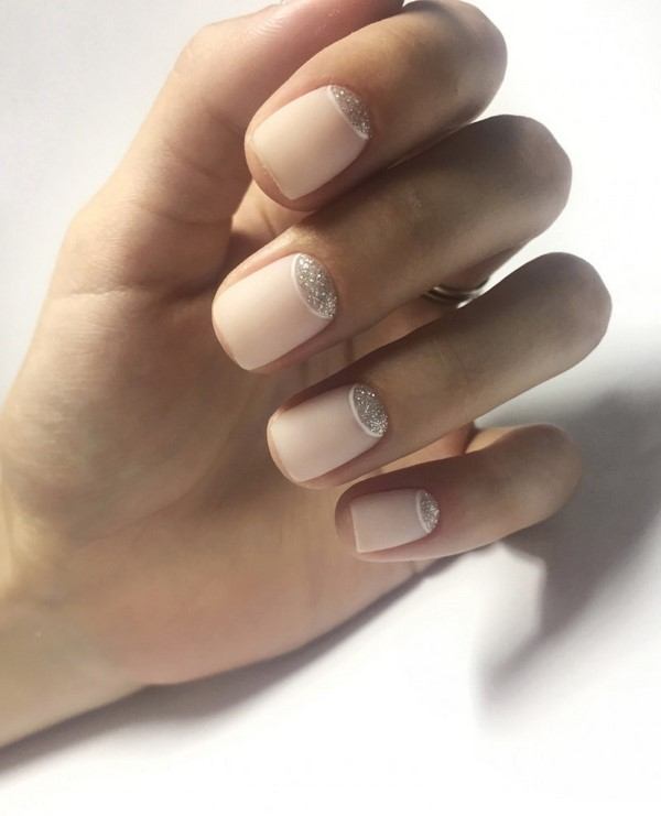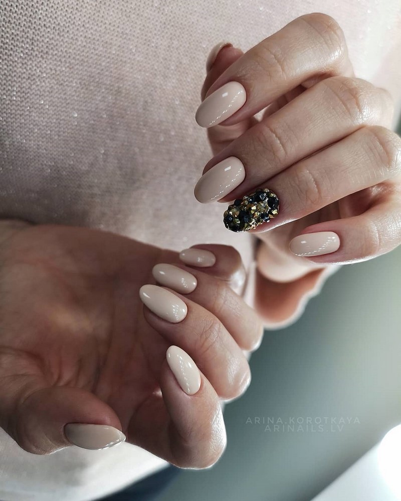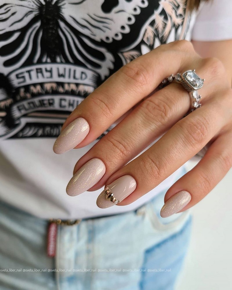 - Цвет нюд с блестками смотрится элегантно и торжественно.