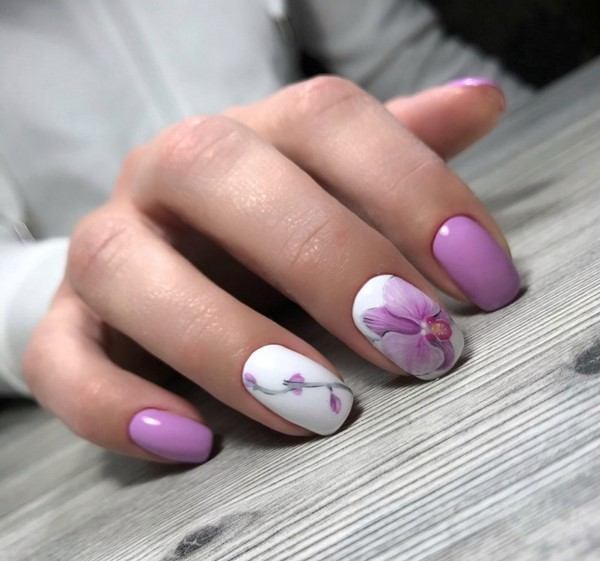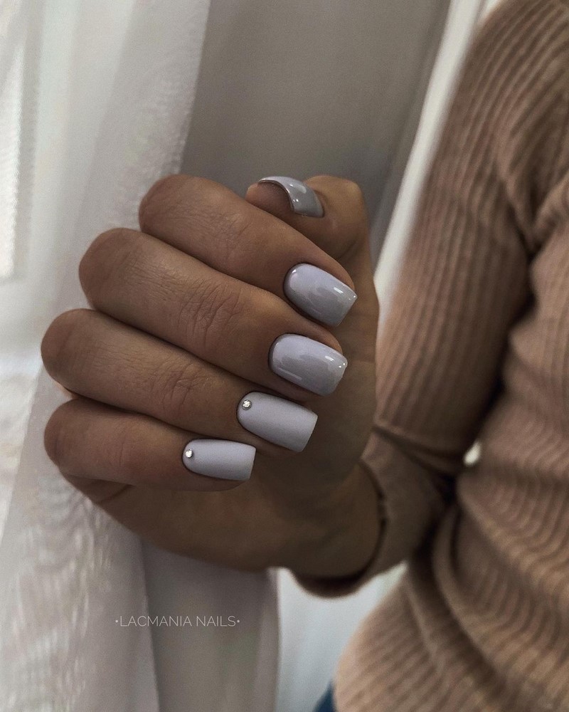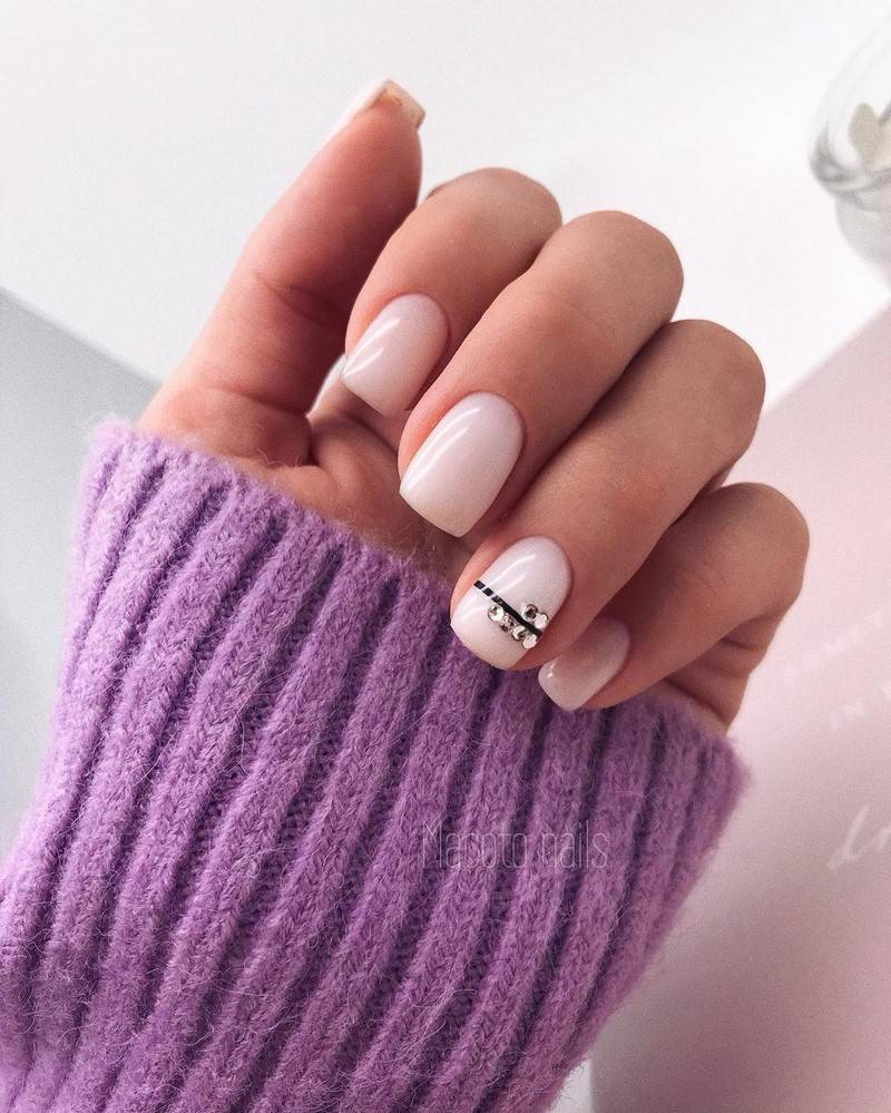 - Цвет. Монотонный дизайн – лучшее решение для короткого маникюра. Достаточно сложно подобрать оттенок, который будет визуально корректировать длину или форму ногтя. Прекрасно справится с этой задачей белый цвет. Оттенки нюд также хороши. Беспроигрышно смотрятся матовые тона с легкими оттенками розового, серого или сиреневого;