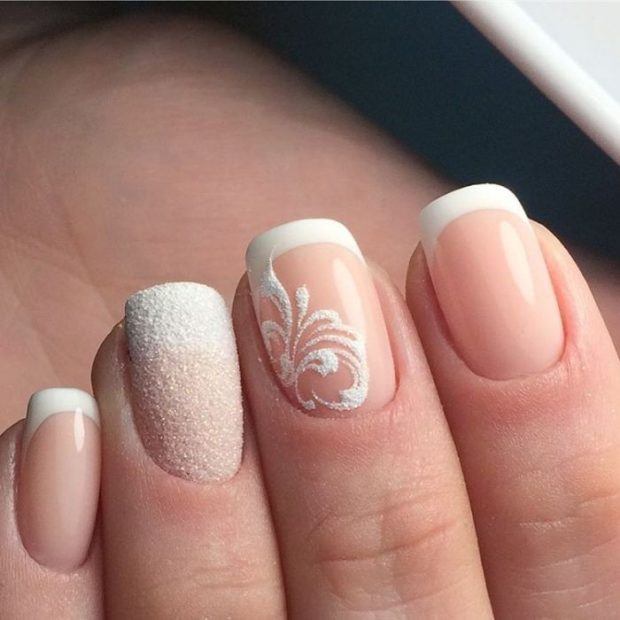 - Французский маникюр — классический вариант, который является действительно очень шикарным и по этой причине как нельзя более подходящим для свадебного нейл-арта. Французский маникюр также имеет разные варианты дизайна — классический, омбре, округлый или геометрический в зависимости от формы ногтей;