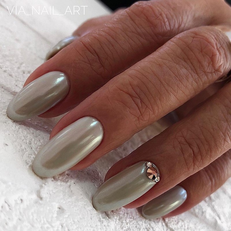 Среди трендов свадебного маникюра в 2024 году отдельно стоит блеск перламутра. Такая втирка будет красиво переливаться во время уличной фотосессии, интересно смотреться во время праздника в помещении. Втирка может быть как белоснежной, так и с легким розоватым оттенком, блеском металла, золота или серебра.