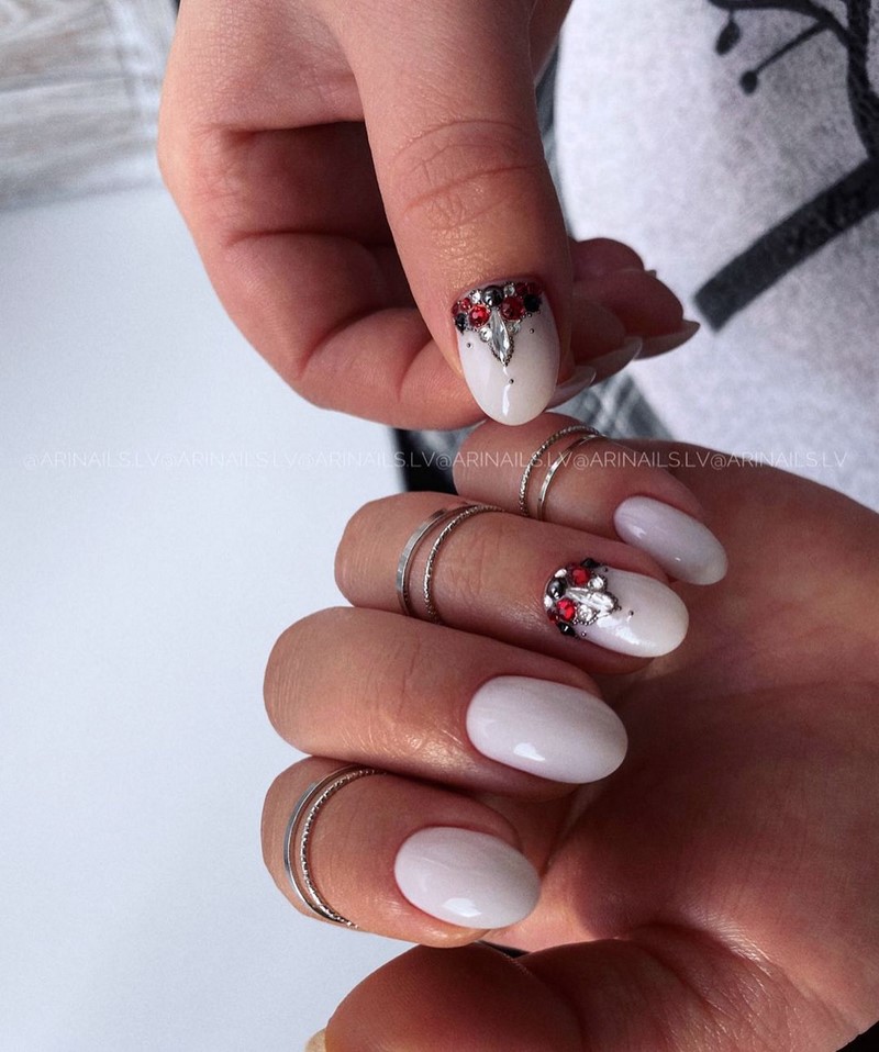 - Маникюр с акцентом на стразы — отличная персонализация ногтей, которая привнесет в наряд девушкти или же женщины, которая вступает в брачные отношения, нотку гламура;