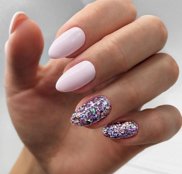 Блёстки – еще один вариант модного дизайна ногтей невесты. Такой вариант смотрится очень привлекательно. Блестки размещают по всей поверхности покрытия, только на лунке или кончике, декорируют ими френч и другие варианты маникюра.