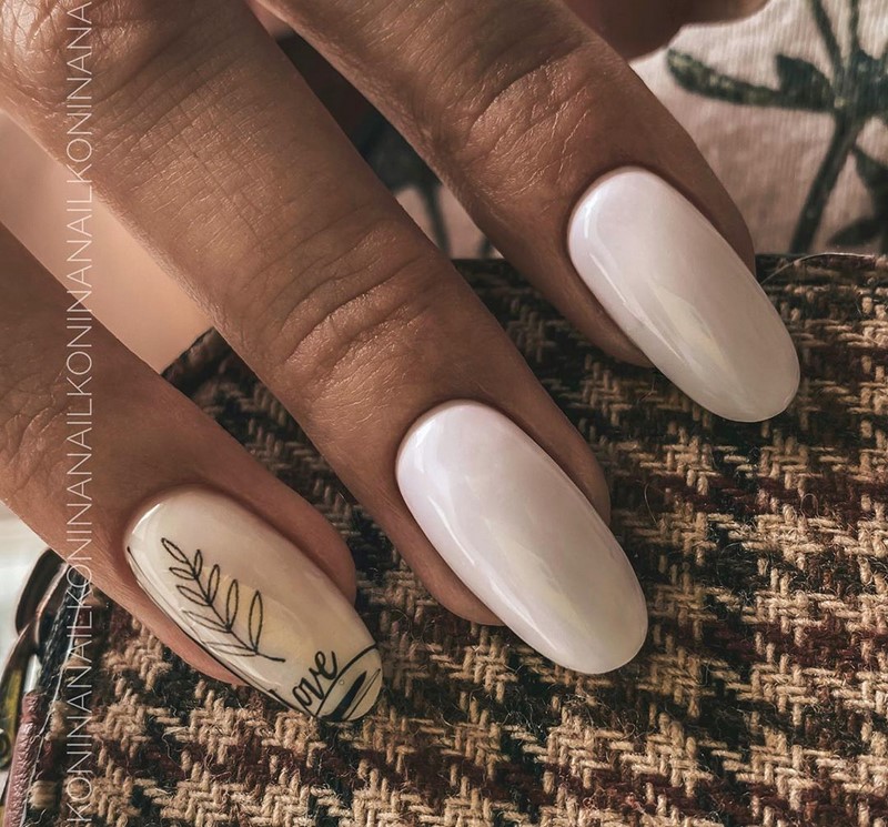 Для свадебного маникюра с ногтями в форме миндаль, можно сделать вензеля. Эти нежные украшения смотрятся очень роскошно, станут отличным дополнением образа в тандеме с пышным платьем и ажурными вставками. Можно выбрать бежевые тона, традиционный белый, благородные золото или серебро.