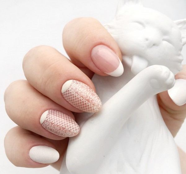 - Чередование классического френча и цвета нюд. Ногтевые пластины полностью покрываются лаком бежевых тонов, часть пластины оформляется белым кружевным орнаментом;