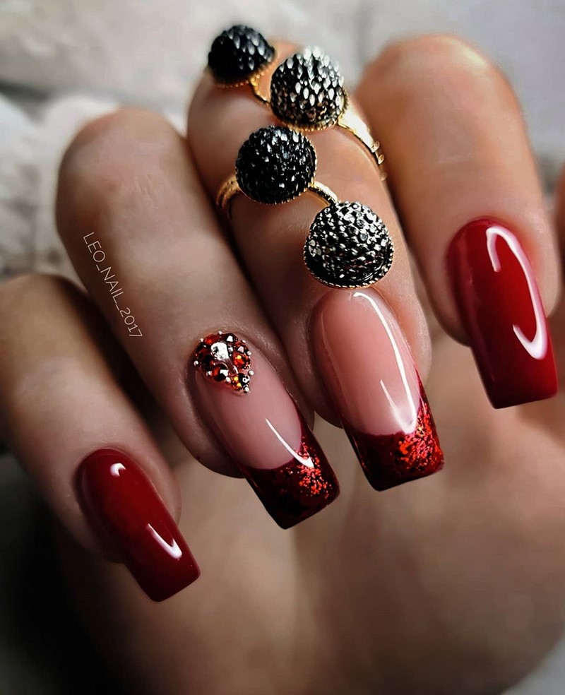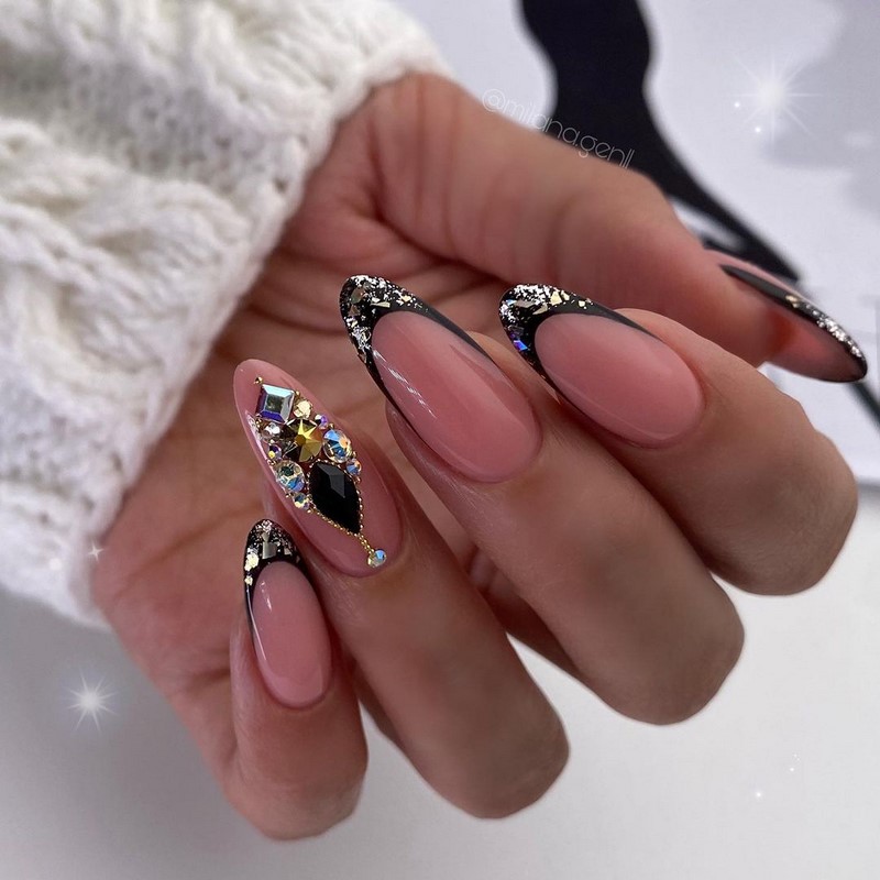 - френч — традиционный, треугольный. Декор — стразы, полоски из лака с блестками;