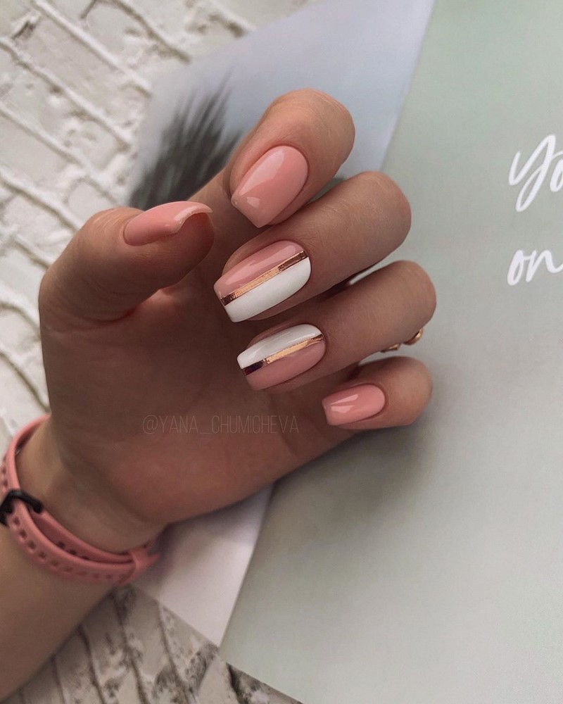Можно использовать несколько цветов гель-лака, сочетая и комбинируя их. Приемлемы такие цвета, как белый и розовый, розовый и бежевый.