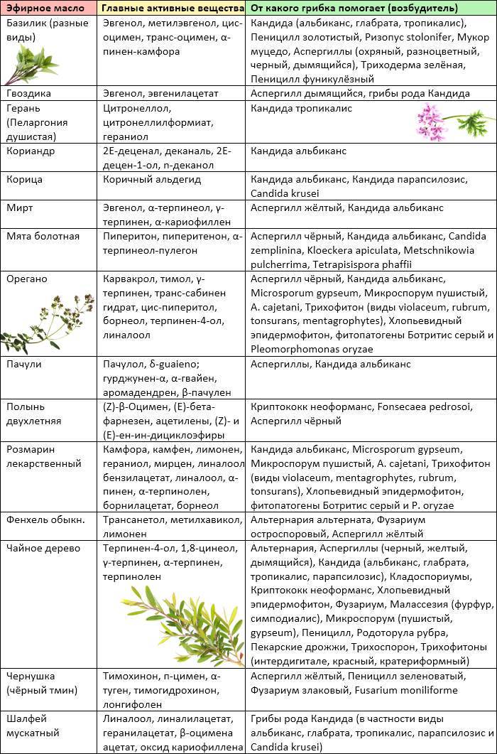 Эфирные масла используемые от онихомикоза должны иметь следующий спектр действия, перечисленный в таблице.