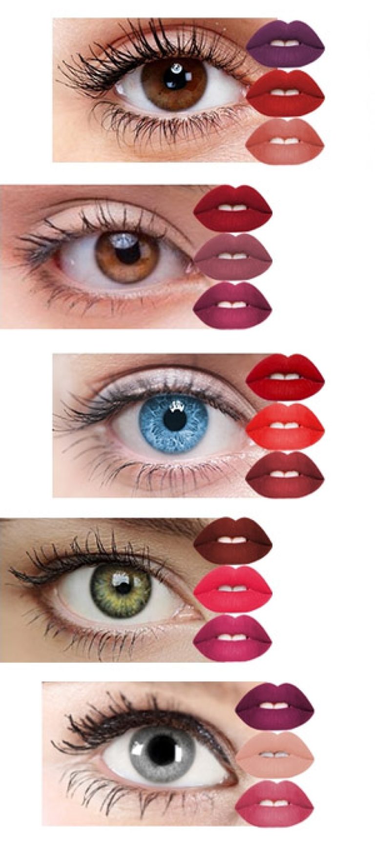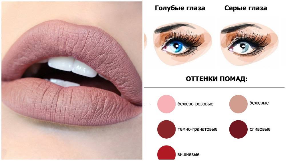 - для голубых и серых глаз может подойти косметическое средство, сочетающее в себе красные и фиолетовые тона, а также любые светлые, легкие оттенки красной (розовой) губной помады.