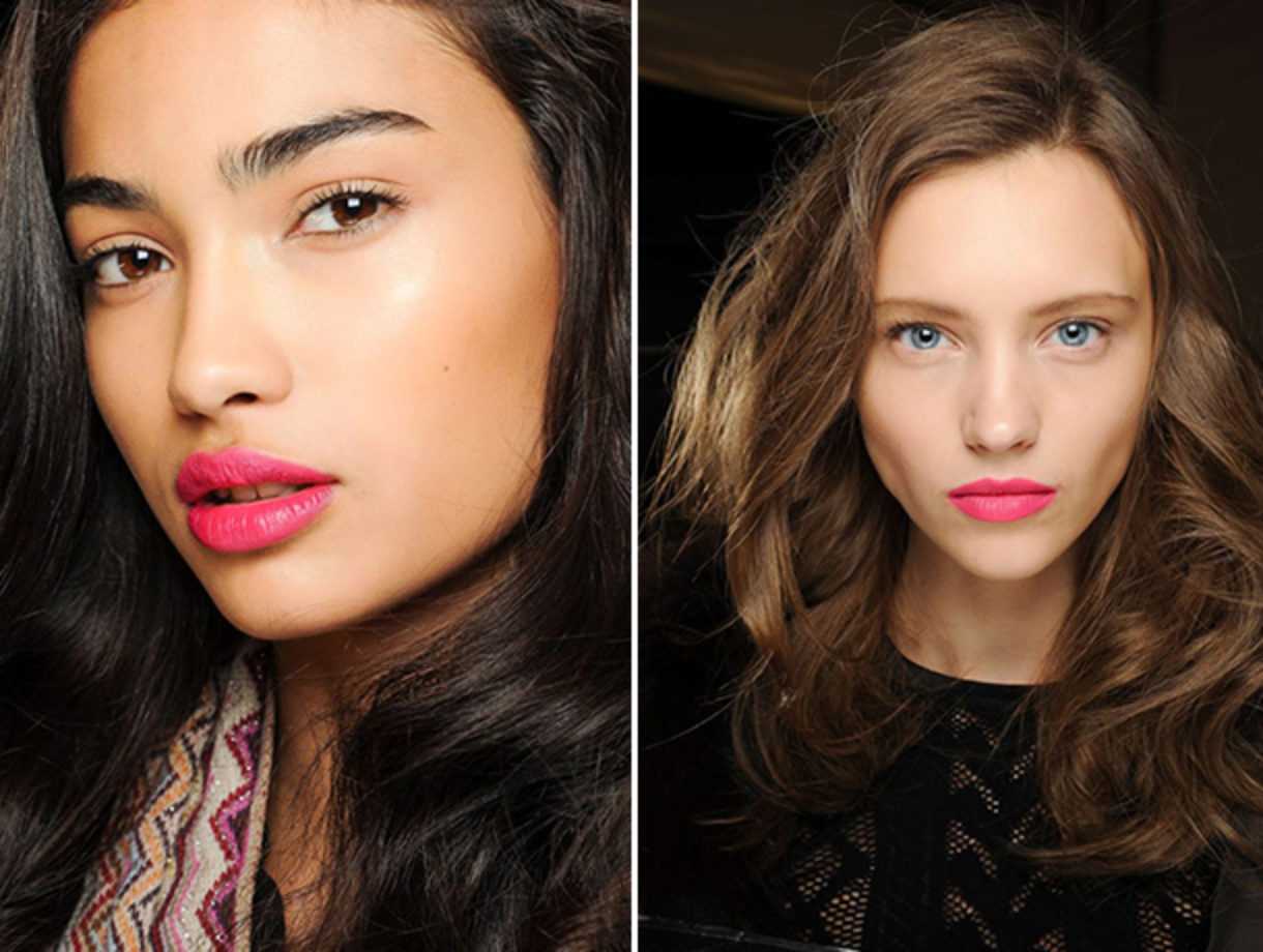 При нанесении помады, не применяйте карандаш. Создается модный эффект размазанных губ. Легкая небрежность в моде, в отличие от четких линий. При создании дневного макияжа используйте яркие тона, но глаза оставляйте практически нетронутыми. Вечером добавьте в образ дерзости, нанесите насыщенные тени и выведите стрелки либо прибегните к макияжу smoky eyes. Завершите образ длинными ресницами, приветствуются накладные пучки.
