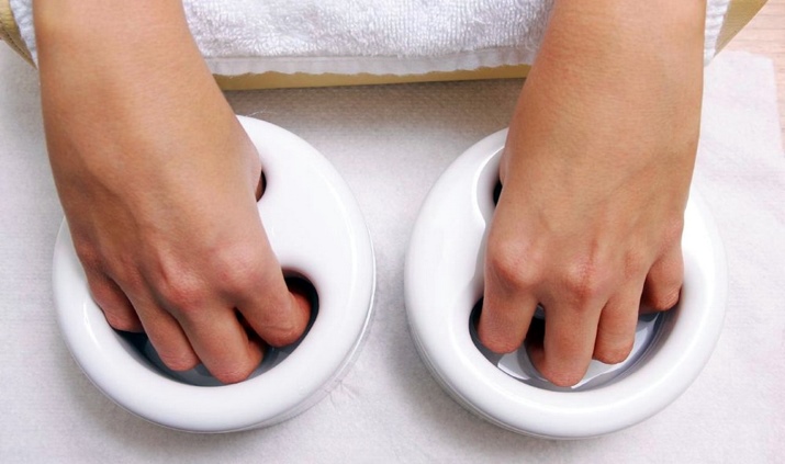 Помещают пальцы в ванночку и в течение получаса расслабляются и отдыхают.