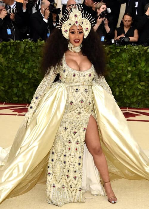 Pregnant with her first baby, the “Bodak Yellow” rapper smashed the Met Gala fashion event with her Catholic-inspired outfit. The striking gown had a slit that showed off her legs and feet.