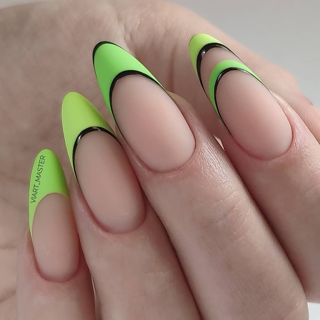 - Нанесите 1-2 слоя светлого лака, не дожидаясь его высыхания, возьмите темный лак и нарисуйте тонкую линию.