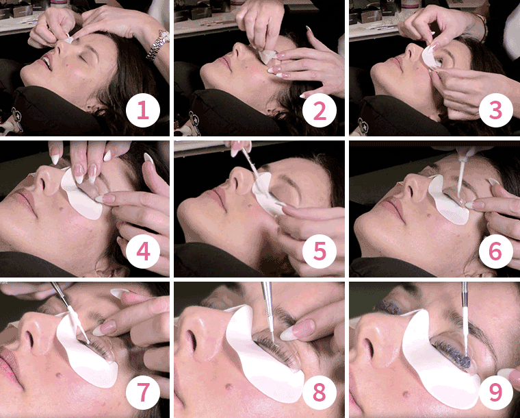 Лифтинг ресниц проводится в строгой последовательности в пять этапов.