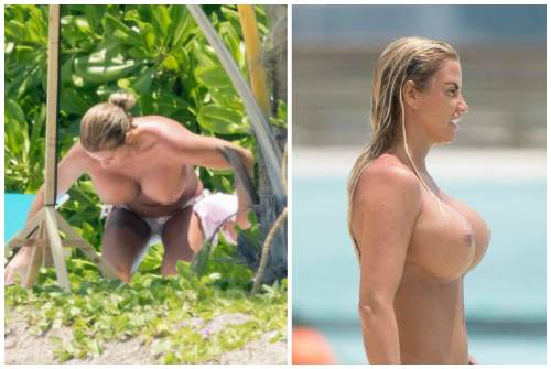 Снимки Кэти Прайс до и после пластики груди остаются максимально откровенными. Женщине не достаточно появляться на красной дорожке в откровенно вульгарных нарядах, она пошла дальше. Недавно Кэти Прайс на пляже поразила поклонников, так как голая позировала перед камерами фотографов. Снимки на Мальдивах без цензуры быстро облетели интернет, вызвав массу разговоров и пересудов о моральном облике матери пяти детей, и об огромной груди, которая давно стала визитной карточкой популярной модели.