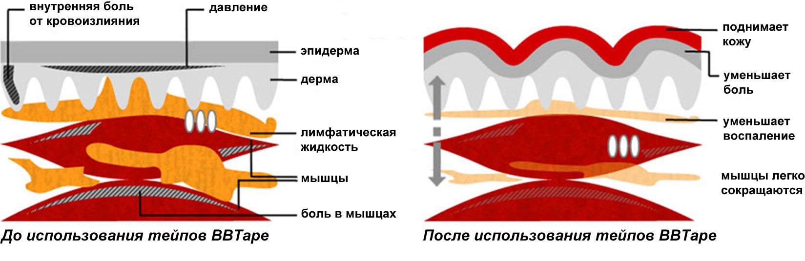Принцип действия кинезио тейпов обусловлен анатомическими особенностями функционирования мышц. При повреждении мускулов неизбежны отеки, воспаления, как следствие — нарушается процесс тока крови и лимфы, пострадавшая от растяжений ткань недополучает кислород, питательные вещества, необходимые для регенерации. Спортивный пластырь решает эти проблемы, как бы принимая на себя часть нагрузки, поддерживая мышцы. После наложения кинезио тейпов гематомы спадают значительно быстрее, исчезают болевые ощущения, прекращается воспалительный процесс.
