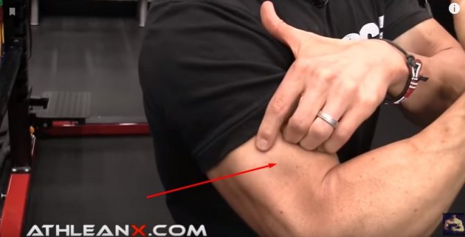 Если на нее надавить, возможно, вы почувствуете боль, поскольку это довольно распространенная триггерная точка у людей, занимающихся тренировками верхней части тела. Боль именно вот в районе брахиалиса.