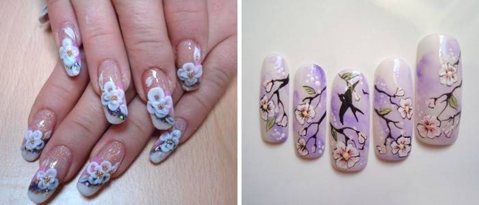 Техника росписи сложна, но мастера создают такие сочетания цветов и росписей, что каждый маникюр становится эксклюзивным произведением искусства. Цветы выглядят как живые, яркие сочетания погружают нас в мир восточной природы.