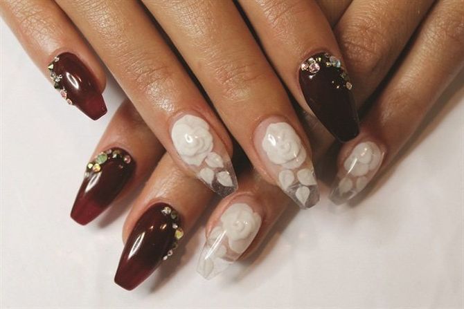 Самыми популярными мотивами в китайской росписи являются розы, пионы, ромашки, лилии, васильки и многие другие. Эта техника – замечательная альтернатива лепке, при взгляде на разукрашенный ноготок кажется, что роскошный букет можно потрогать руками, а нераспустившаяся роза вот-вот раскроет волшебные лепестки.
