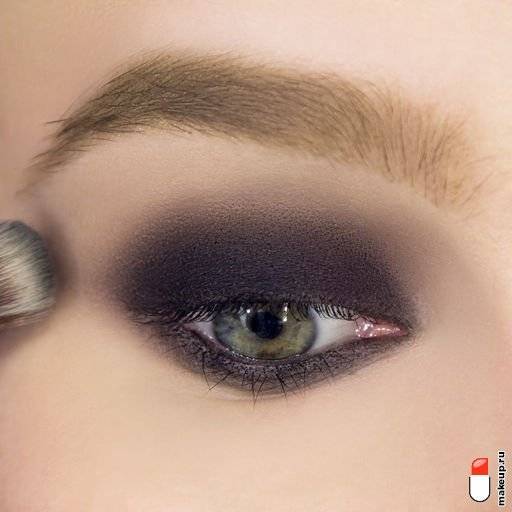 - большой плоской кисточкой растушевать верхнее веко, используя фиолетовые, серые, коричневые или бронзовые оттенки;