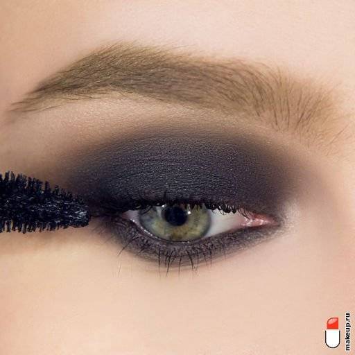 Завершающий этап – покраска ресниц черной тушью. Для повседневного мэйкап smoky eyes достаточно одного слоя, для вечеринки можно несколько раз прокрасить реснички.