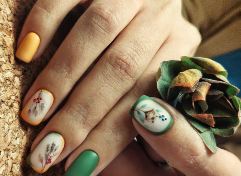 - цветы в качестве дополнительного дизайна — на 1-2 пальцах полевые цветы в нежных тонах, на остальных нанесен френч;