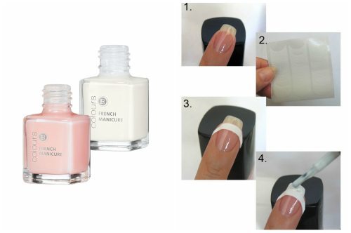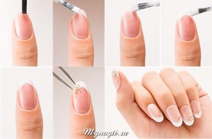 - Для начала выполняется французский маникюр по любой из описанных выше схем. Не наносится лишь финишное бесцветное средство.