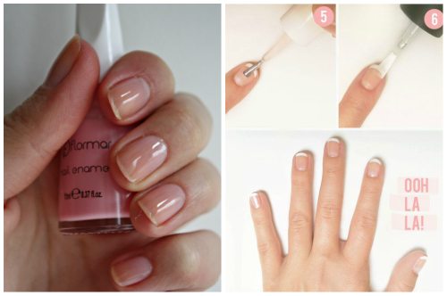 Эта техника несколько сложнее, мало у кого получается с первого раза. Но не стоит отчаиваться, главное – терпение и практика. Процесс выполнения французского маникюра в домашних условиях кистью выглядит следующим образом: