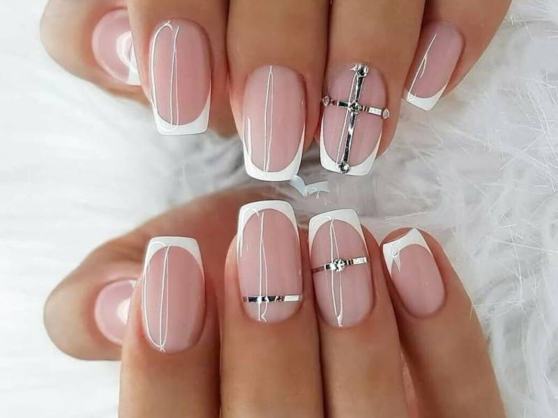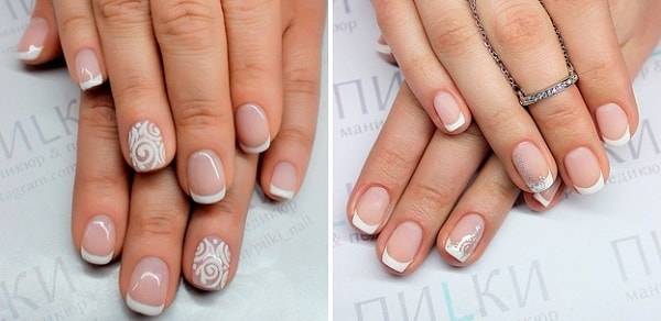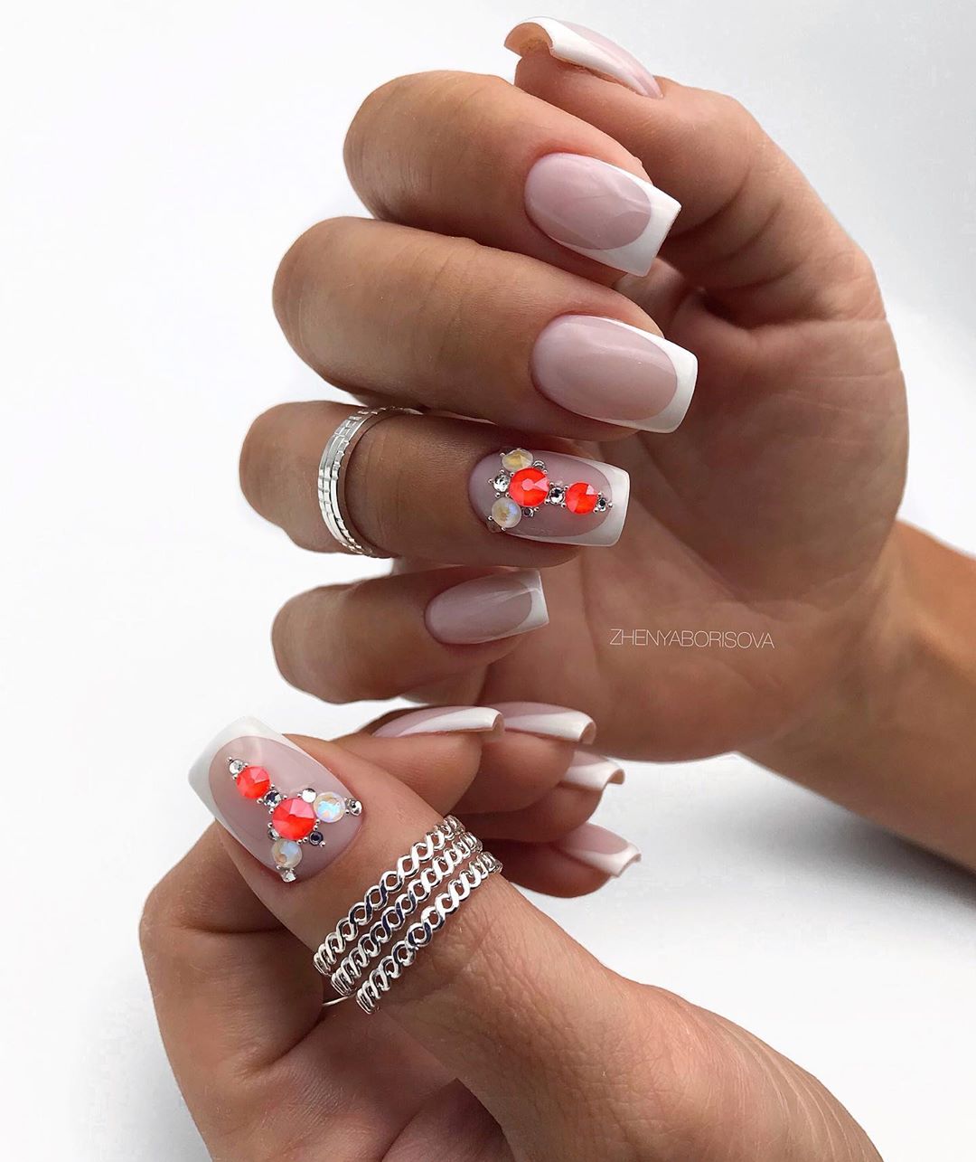 Модный френч можно дополнить изящными украшениями. Классические телесно-белые вариации очень украсят