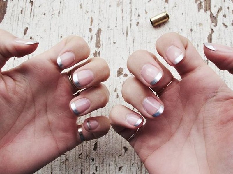 Самый простой вариант декора – тонкая золотистая или серебристая полоска, проведенная по границе ногтевого ложа и белого кончика. Линия рисуется тонкой круглой кисточкой. Она не только украсит маникюр, но и поможет замаскировать не слишком ровную границу нанесения лаков.