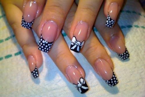 - френч с рисунком (на край ноготка наносятся специальные трафареты с рисунком/узором, добавляются стразы, камни, бусинки и т.д.)