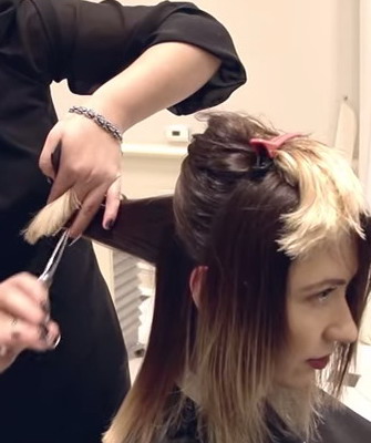6. Затем надо перейти к челке. Распустить волосы в треугольнике, вытянуть их вниз и скрутить жгутиком. Затем подрезать жгутик ниже уровня предполагаемой челки на 1—1,5 см.