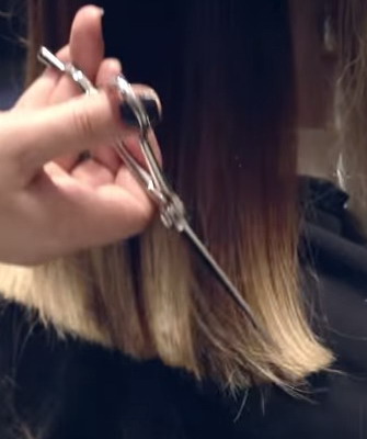 8. Затем с помощью бритвы необходимо завершить стрижку. Быстрыми движениями обеих рук выполнить филировку бритвой. Это сделает прическу более легкой и пышной.