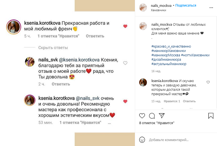 Учтите: наибольшее доверие у пользователей вызывают отзывы, рассказывающие историю и раскрывающие те или иные детали. Так, клиенты могут сделать акцент на том, что у вас получилось исправить поврежденный другим мастером ноготь, что дизайн сохранился даже спустя три недели активной носки.