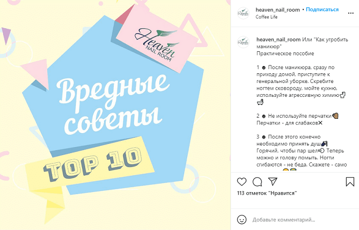Регулярное добавление полезных лайфхаков усилит лояльность целевой аудитории и поспособствует увеличению вашей базы подписчиков. Посоветуйте пользователям, как определиться с формой ногтей, надолго сохранить яркий дизайн или правильно ухаживать за кутикулой.