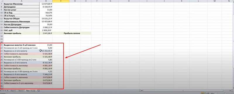 Выручка со 2-го визита (стоимость маникюра на кол-во человек, обратите внимание, стоимость маникюра уже будет обычной, без акции — 1.700 рублей) — 10.202,95 рублей. Себестоимость маникюра (50% от выручки) — 5.101,48 рублей
