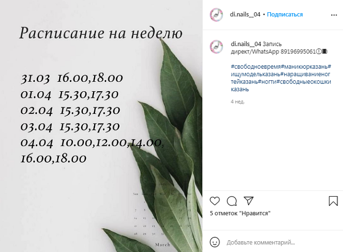 Опубликуйте свое расписание со «свободными окнами» – часами, в которые можно записаться на маникюр. Продублируйте в описание к посту способ связи с вами и добавьте призыв к действию. К примеру: «Успейте записаться, чтобы сделать руки идеальными!», «Запишись и порадуй себя красивым весенним маникюром!».