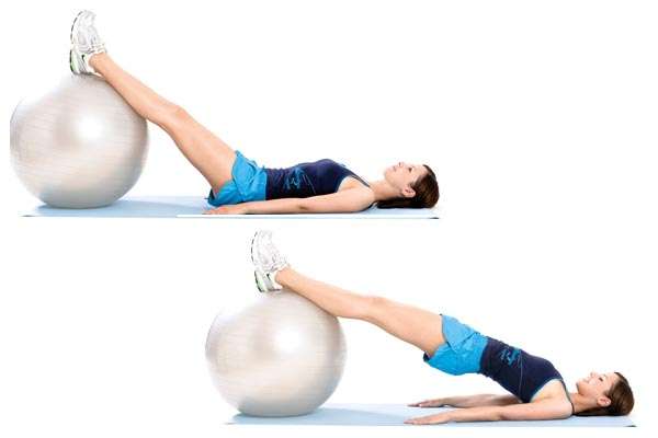 Исходное положение лежа на спине, ноги на мяче. На выдохе поднимаем ягодицы, сокращаем мышцы тазового дна. Возвращаемся в исходное положение.